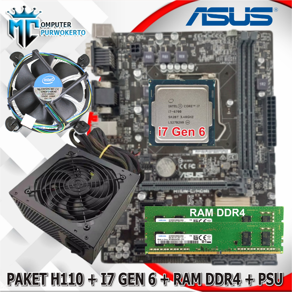 Paket Mainboard Motherboard Mobo H110 LGA 1151 dan Processor i7 6700 Gen 6 RAM DDR4 with Power Supply PSU 500 Watt 80+
