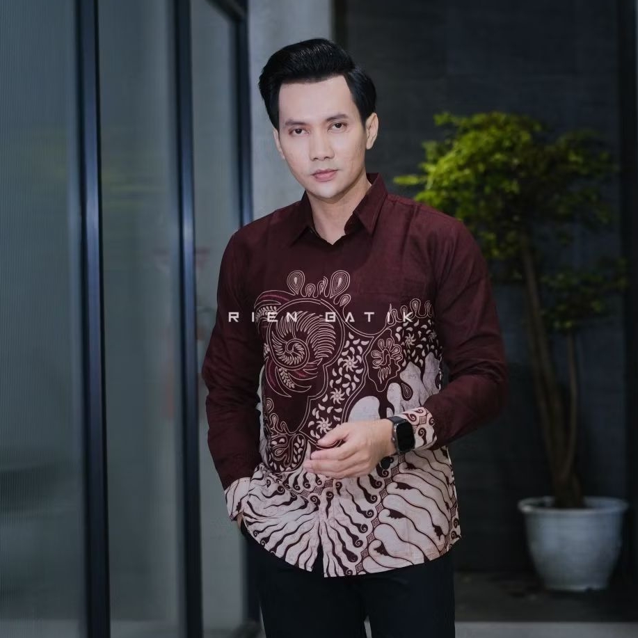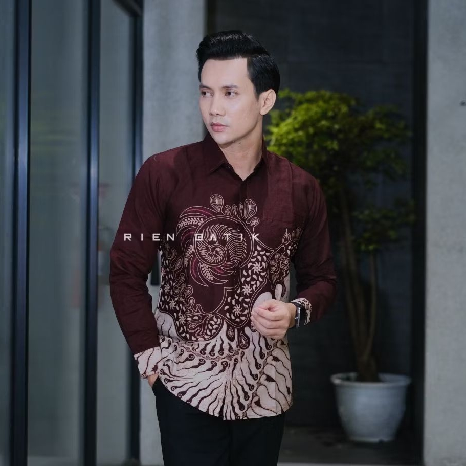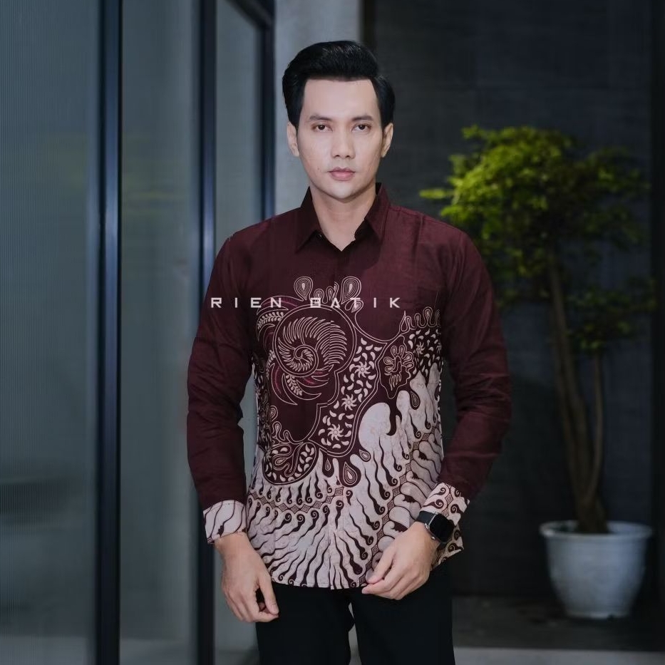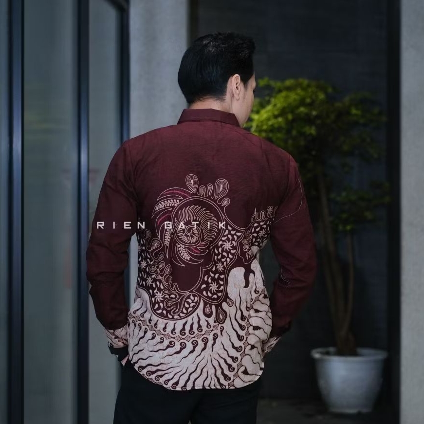 Kemeja batik SLIMFIT pria warna BURGUNDY lengan panjang bahan katun lapis furing premium motif RANGKONG BURGUNDY