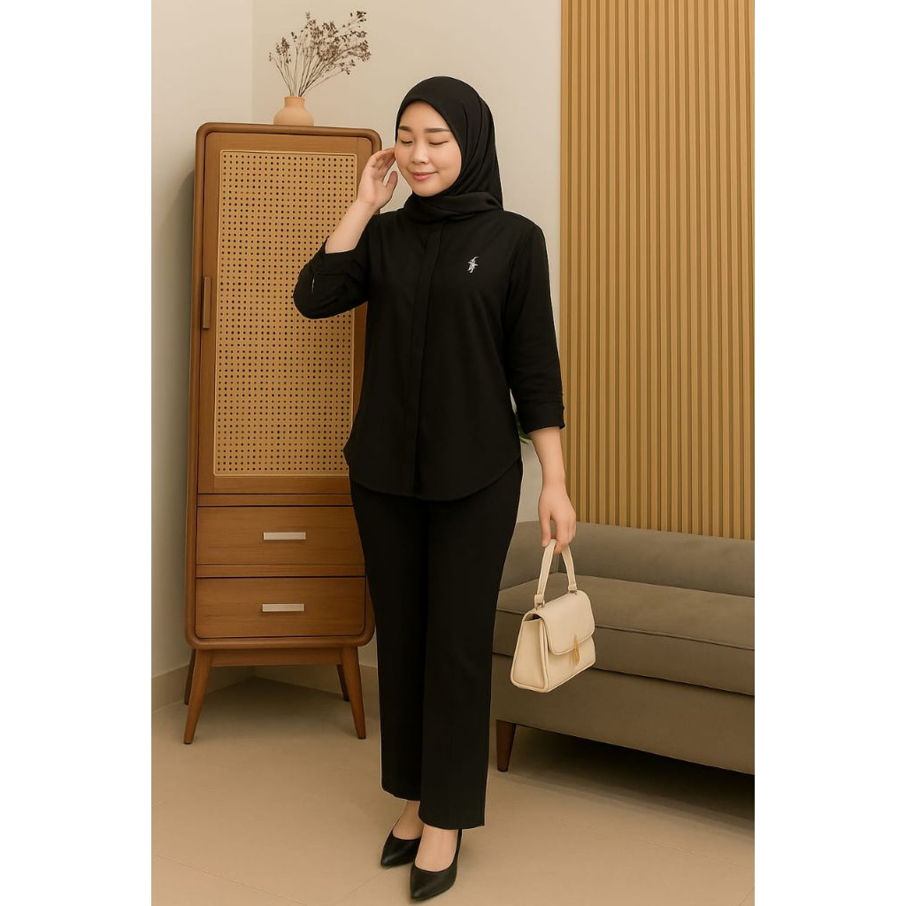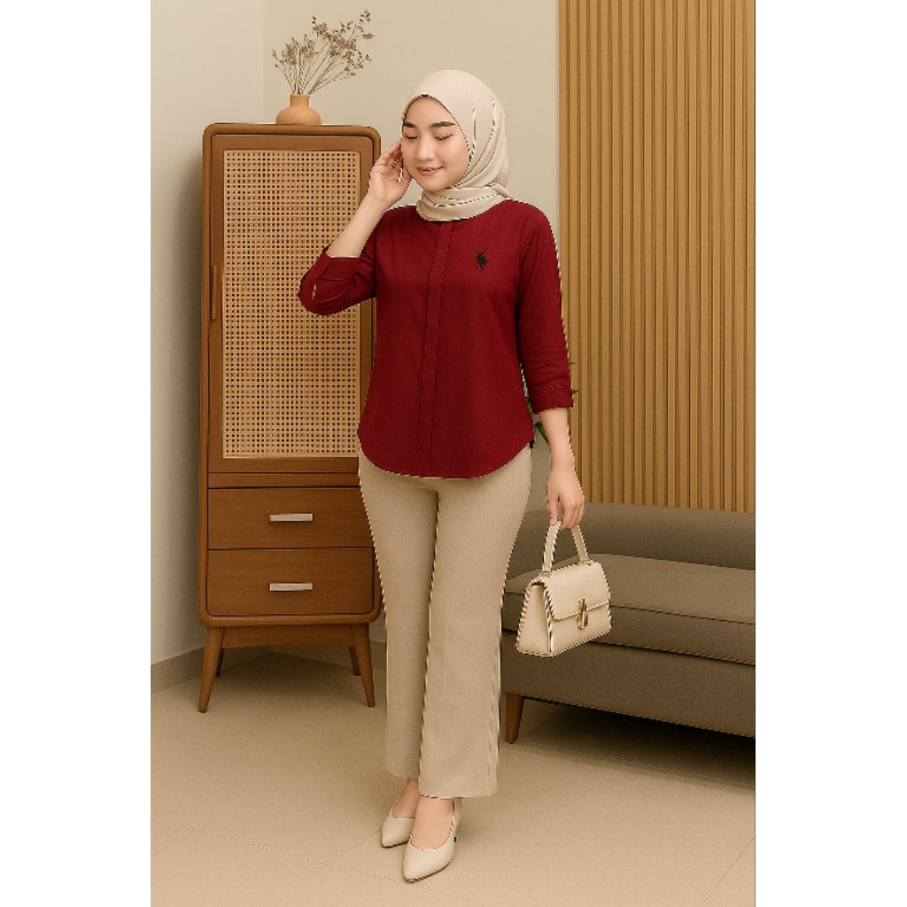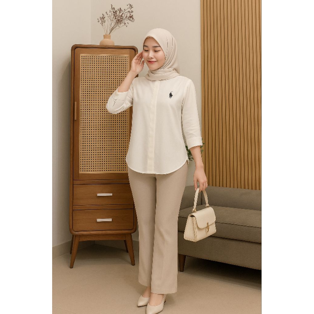 Kemeja Bordir Logo Polo Atasan Wanita Rayon Twill Lengan 7/8 Terbaru