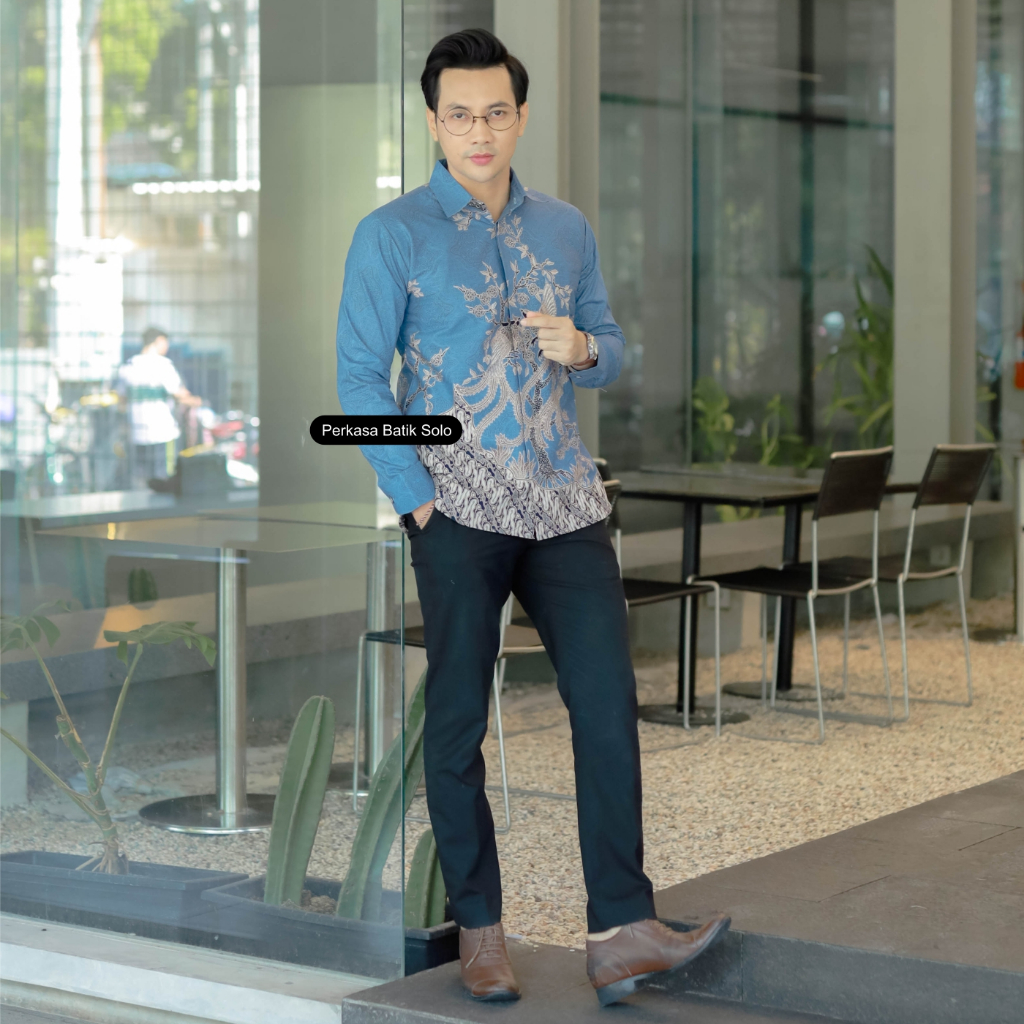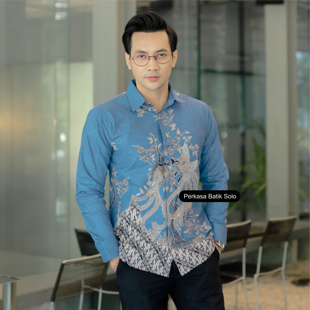 PERKASA BATIK Motif Baswara Biru Kemeja Batik Pria Lengan Panjang Furing Erro Warna Ice Blue Hem Kondangan Cowok