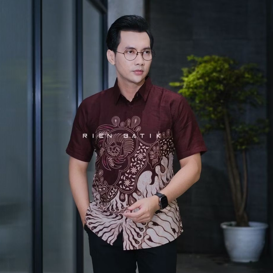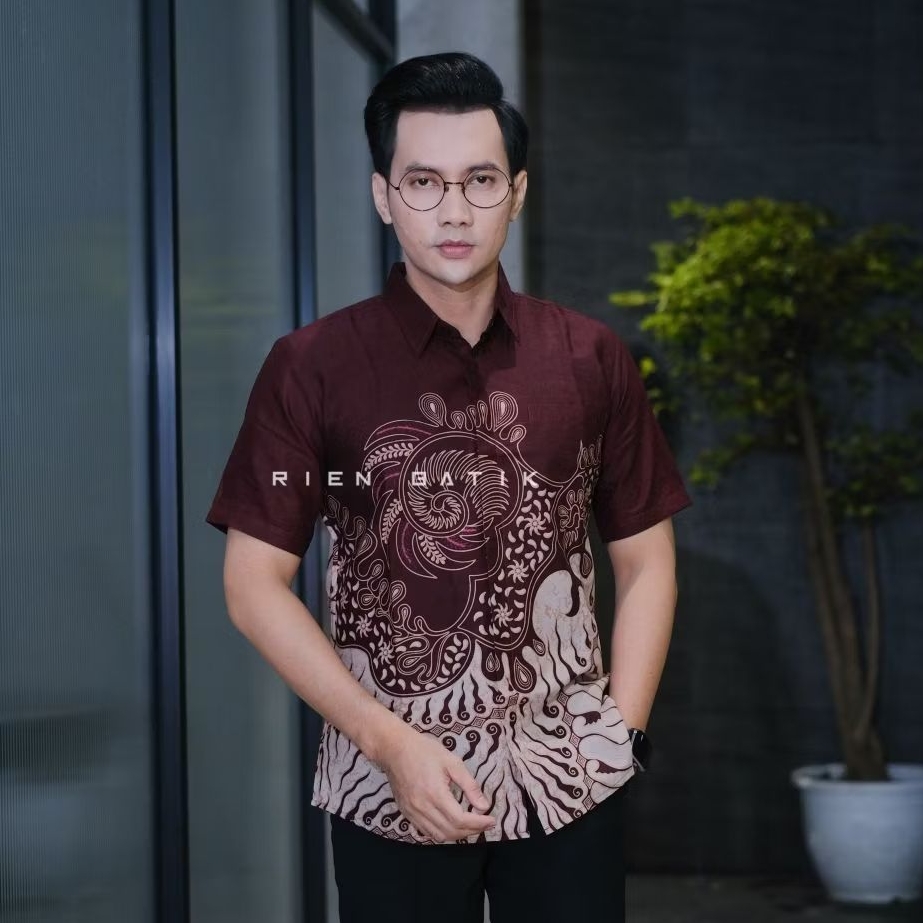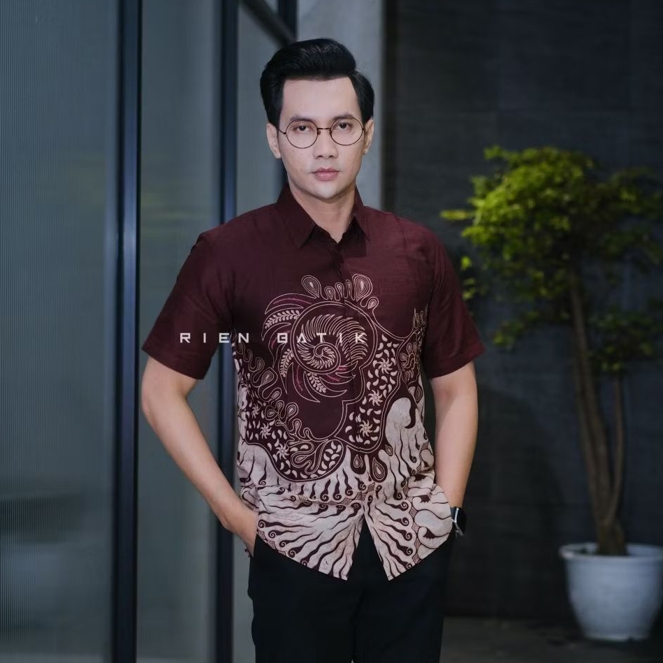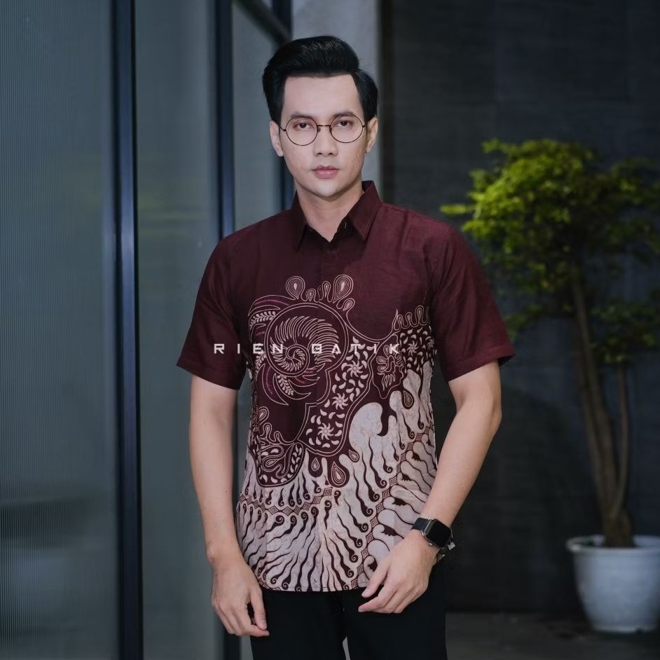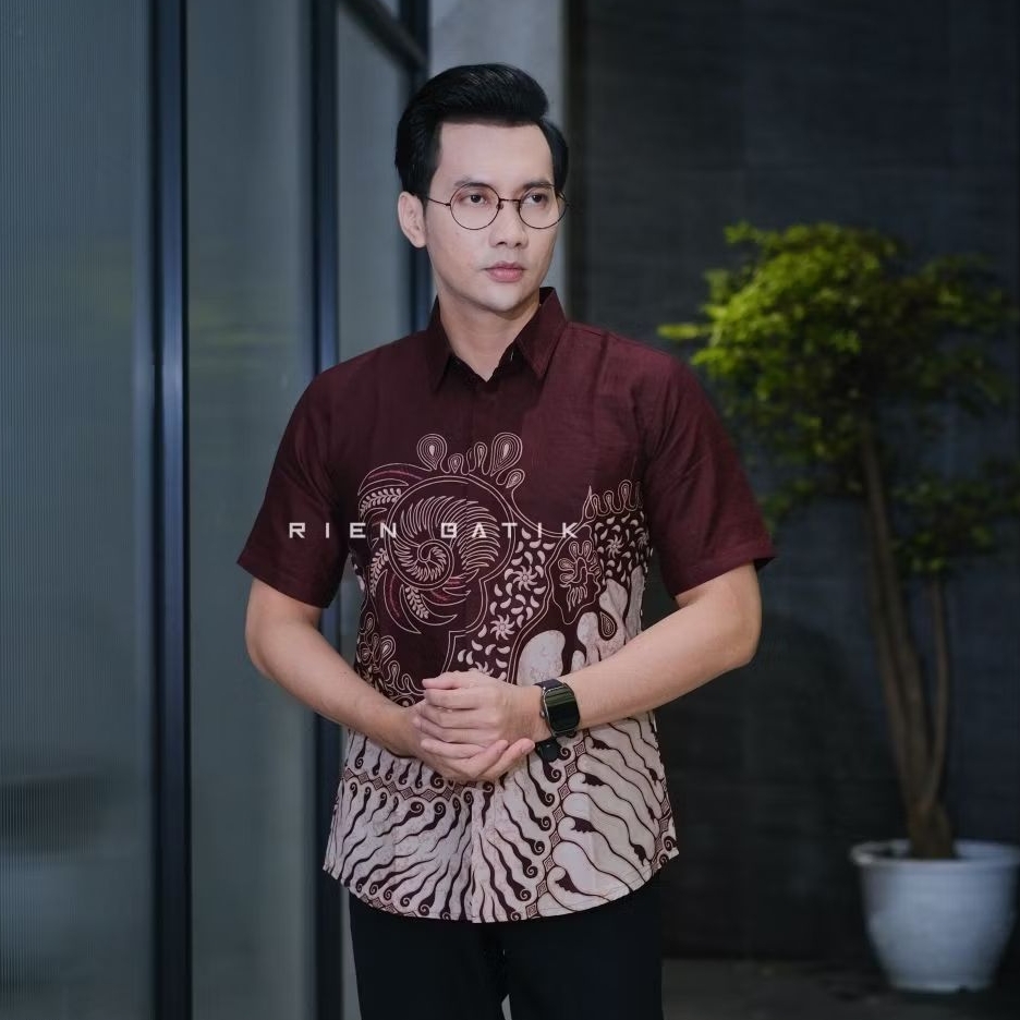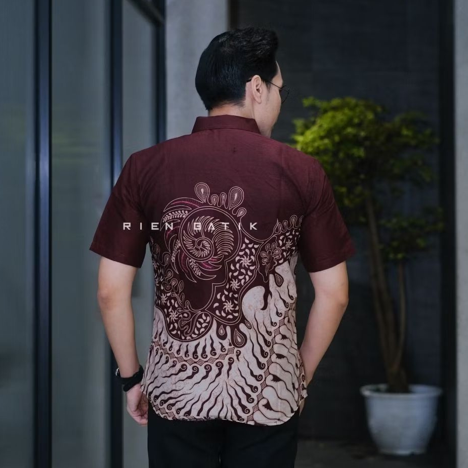 Kemeja batik SLIMFIT pria warna BURGUNDY lengan pendek bahan katun lapis furing premium motif RANGKONG BURGUNDY
