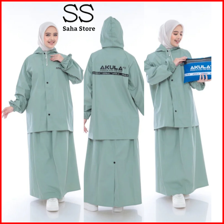 Akula Jas Hujan Raincoat Pria Wanita Anti Rembes Rok Hijau Sage