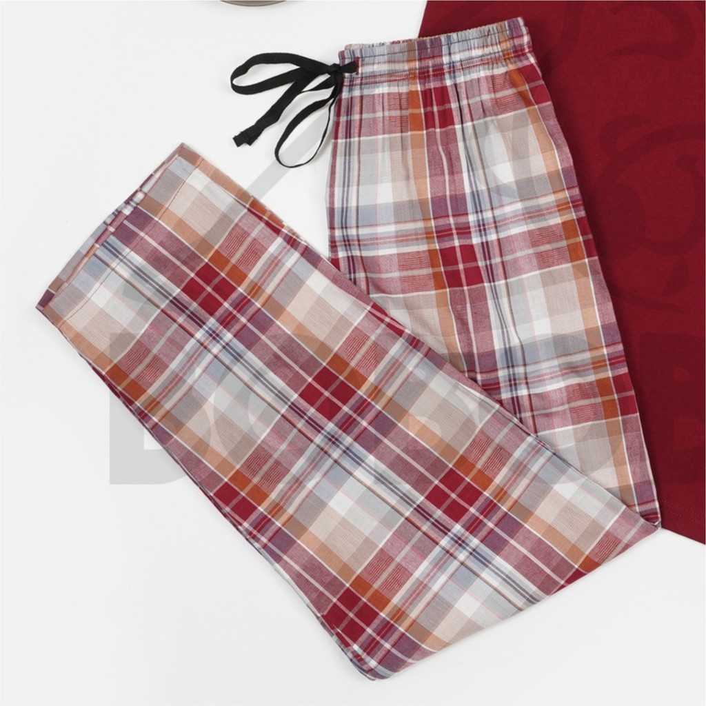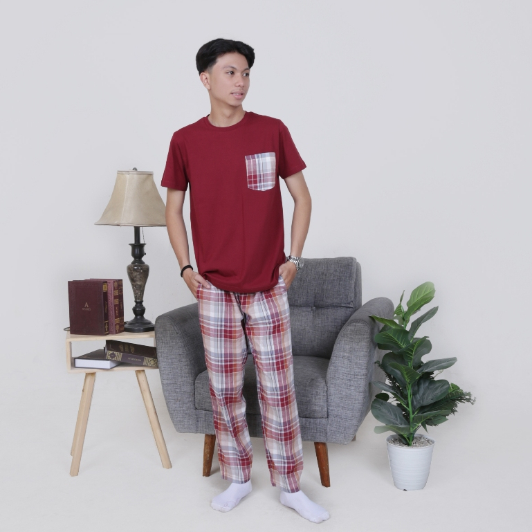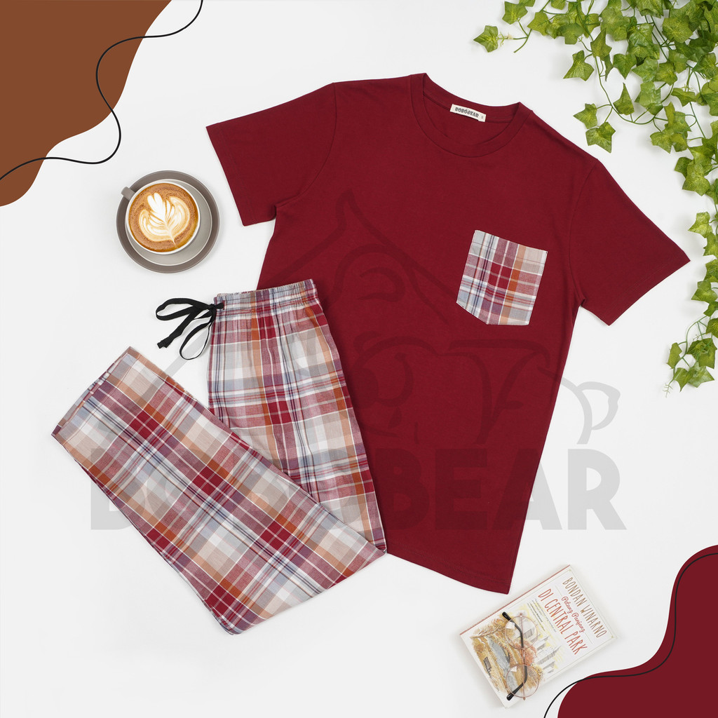 Bobobear Setelan Baju Tidur Piyama Tangan Pendek Dewasa Laki Maroon Plaid Fall