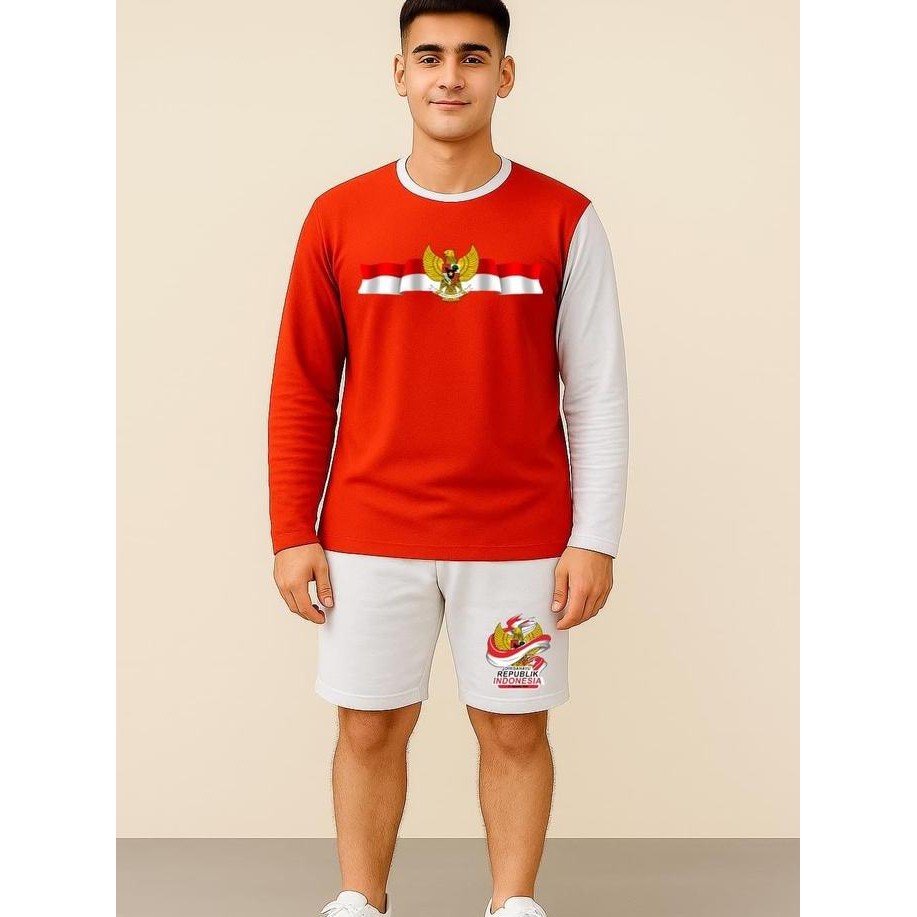 (Allthebest) Setelan Pria Sweater dan Celana Pendek Merah Putih 17 Agustus Kemerdekaan Indonesia Hut RI 80 Seragam Lomba M/L XL XXL | Mukzhop