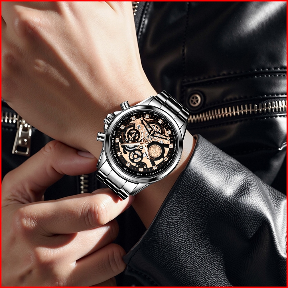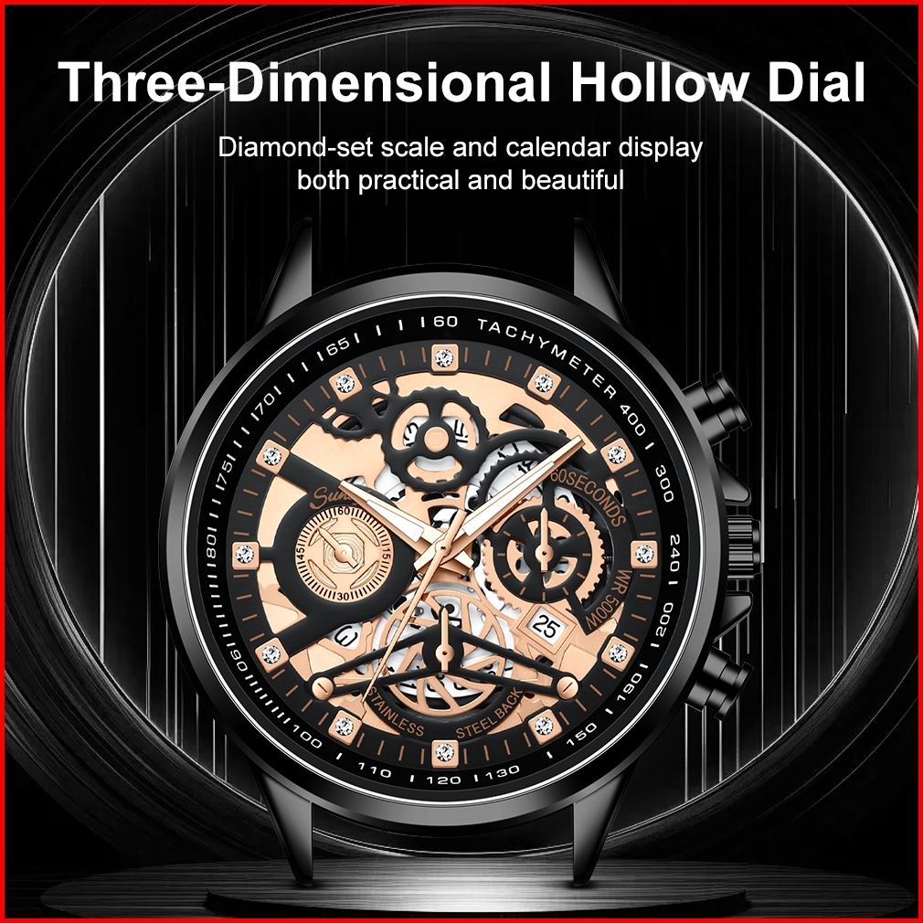 Sunlifex Jam Tangan Pria 3352 Bercahaya Dial Berongga Santai Mode Tali Stainless Steel Kalender Jam Tangan Cowok