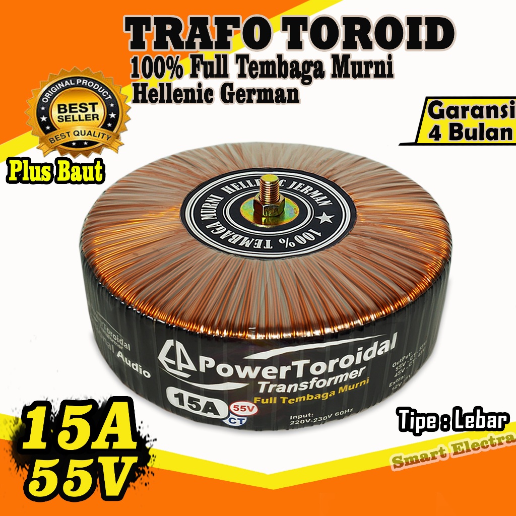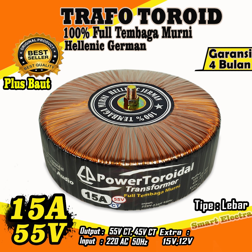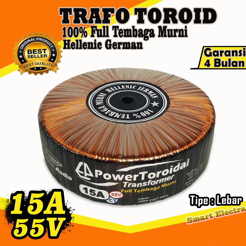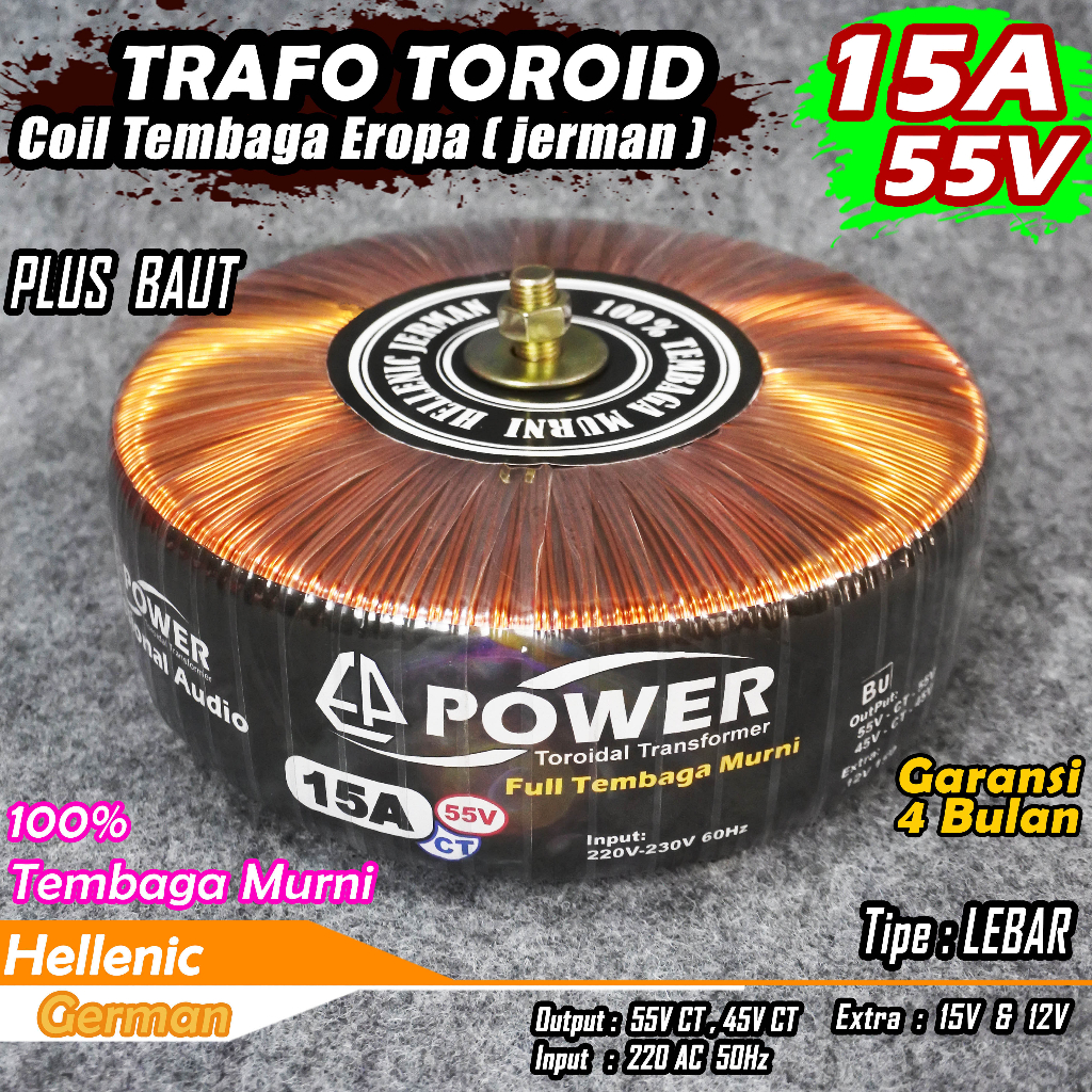 Trafo Toroid 15A 55V Ct - 45V Ct Murni Full Tembaga Murni Helenic Jerman (Tipe Lebar)
