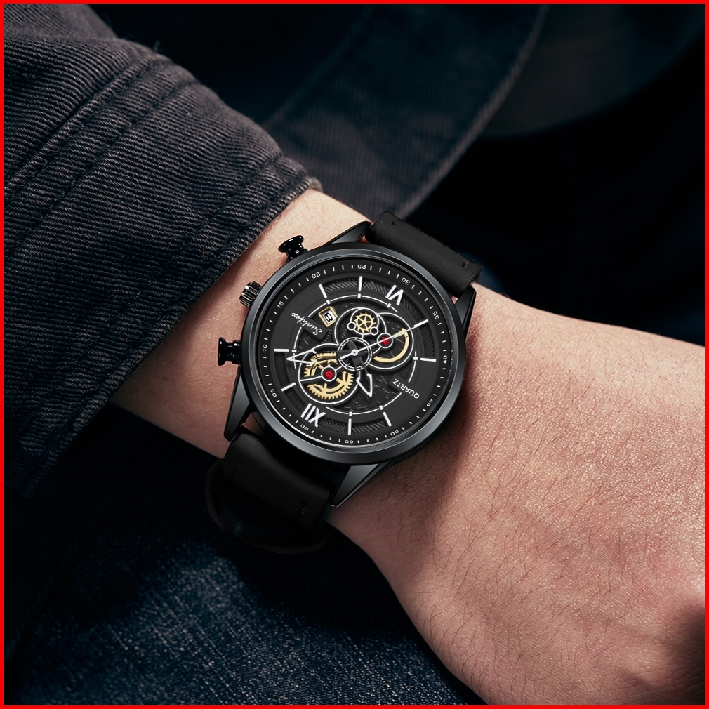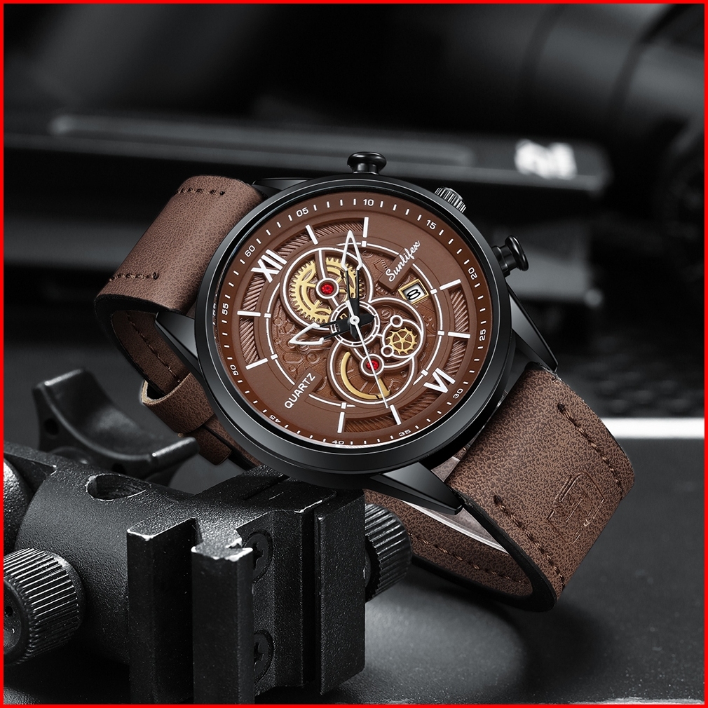 Sunlifex Jam Tangan Pria 9113 Tanggal Analog Santai Kuarsa Tali Kulit Jam Tangan Cowok
