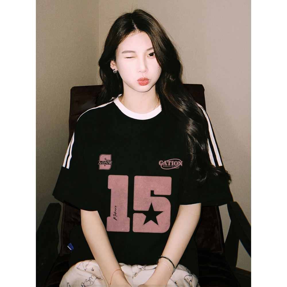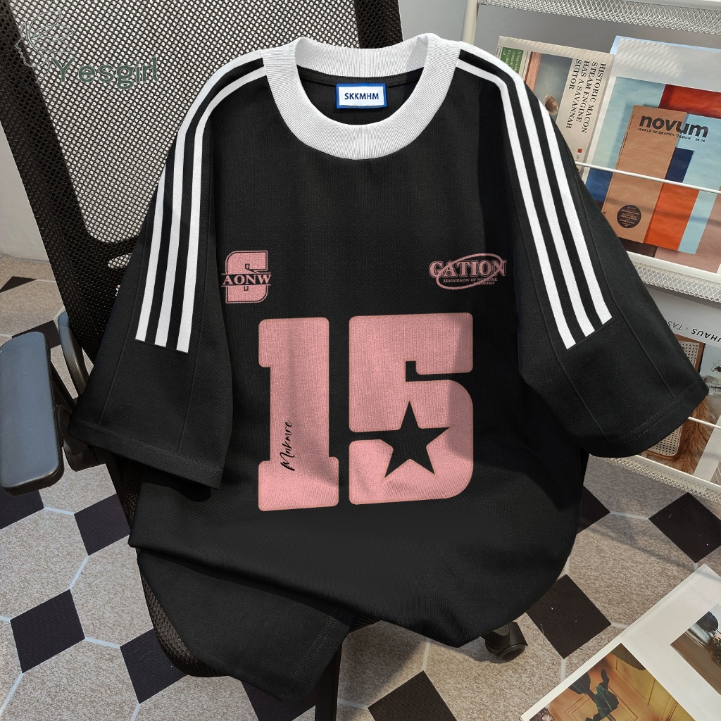 Yesgirl Baju Wanita Putih Black Kaos Premium Lengan Pendek Oversize Kaos Merah Muda Dengan Tiga Garis Dan Nomor 15/