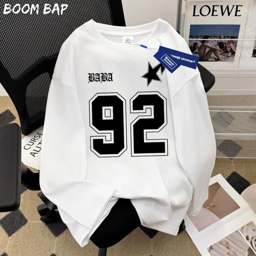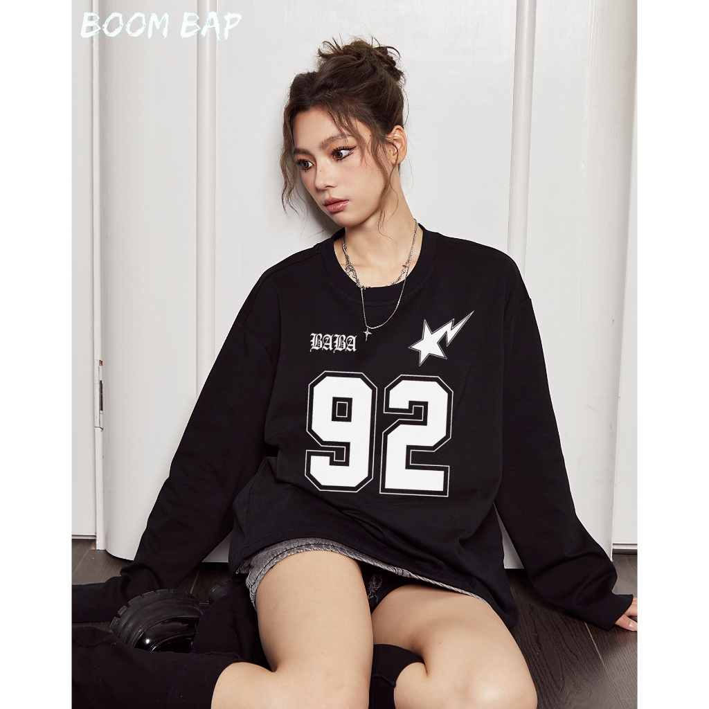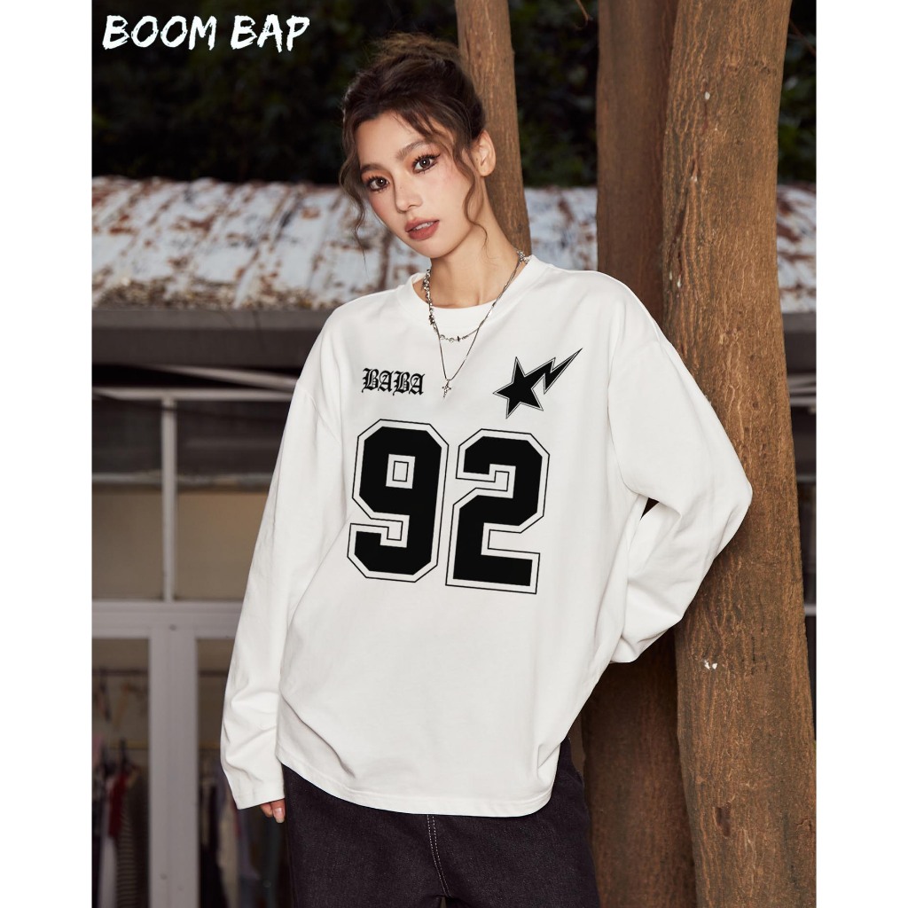 BOOMBAP American retro Style lengan panjang Oversize Nomor 92 Print top| Lengan panjang Wanita Putih | Baju atasan