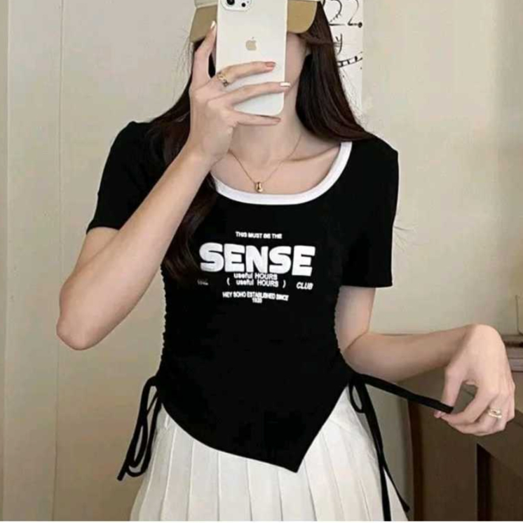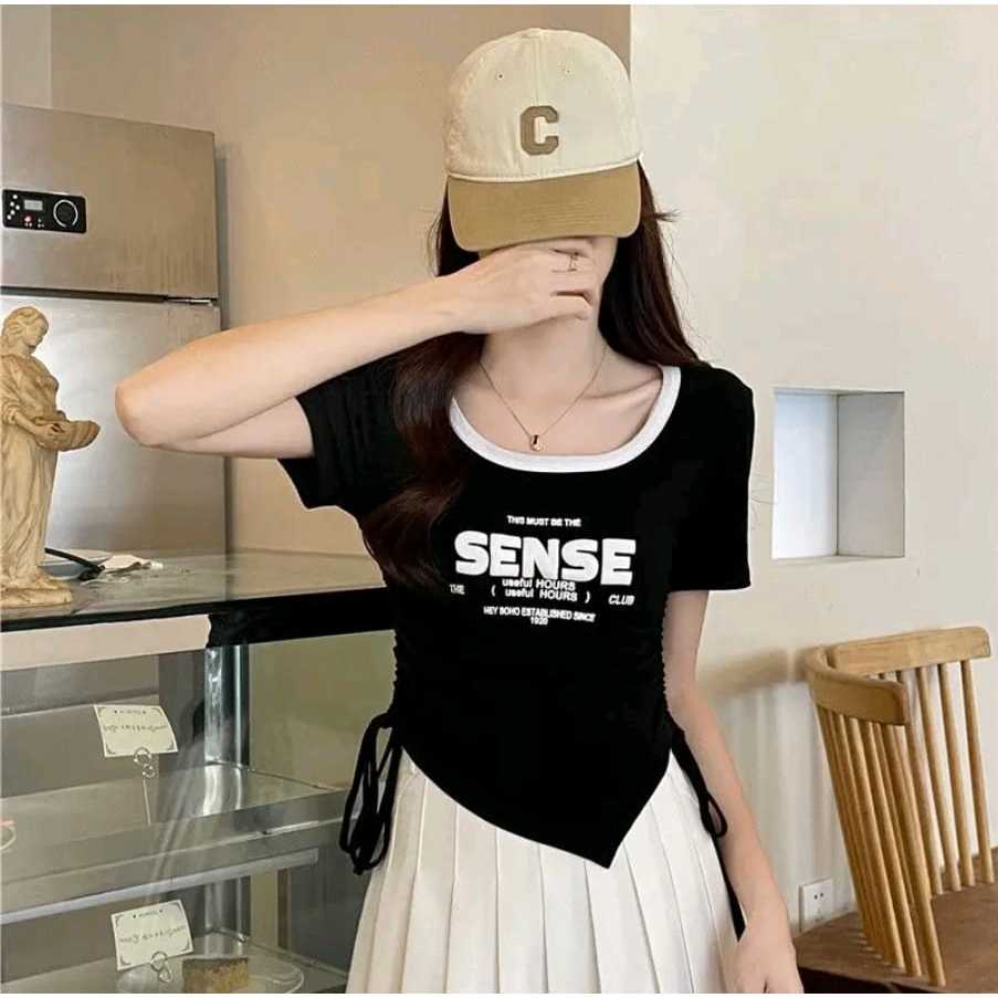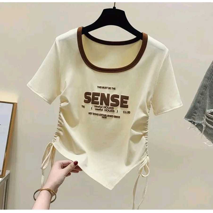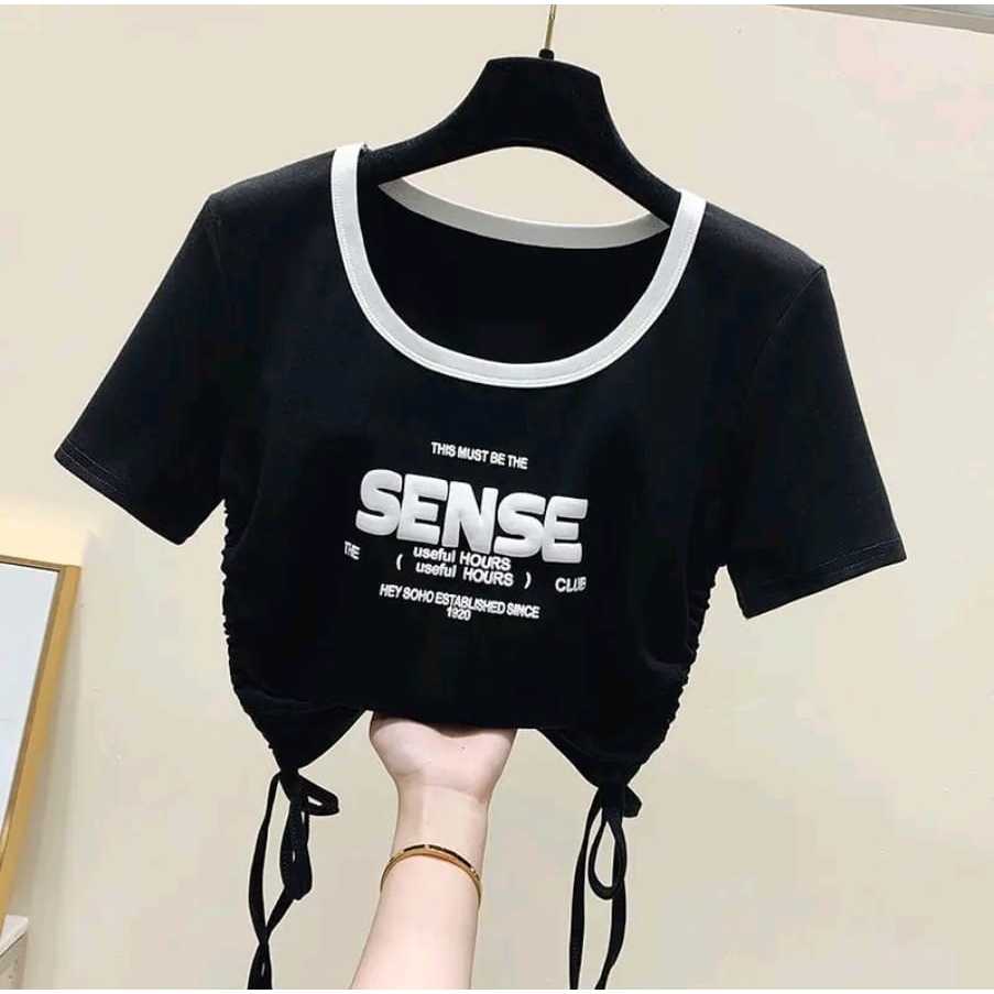 Sense Crope Oversize Baju Serut Wanita Crop top Baju Kaos Wanita Kekinian