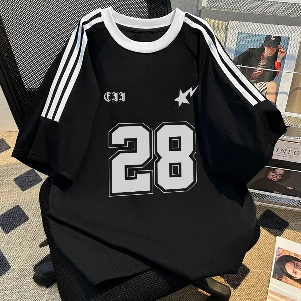 Po floret Kaos Wanita Kekinian Lengan Pendek Number 28 Printed Three Bergaris Bahu Kaos Longgar Tshirt Baju Wanita