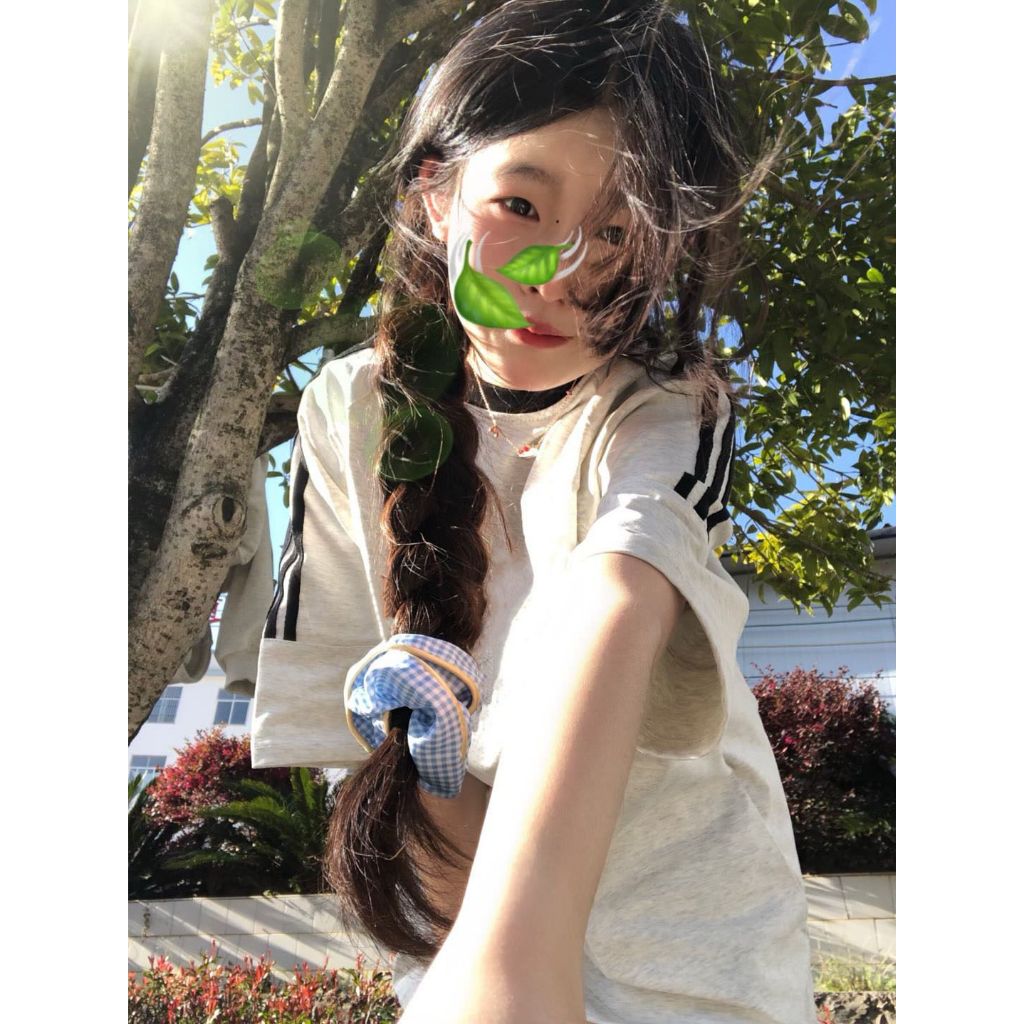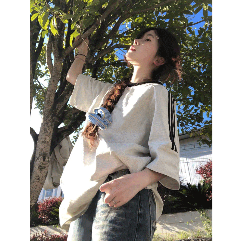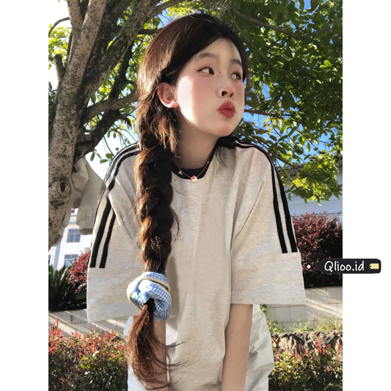 korean Style Atasan wanita / kaos katun lengan pendek tiga garis/Crop top oversize Wanita