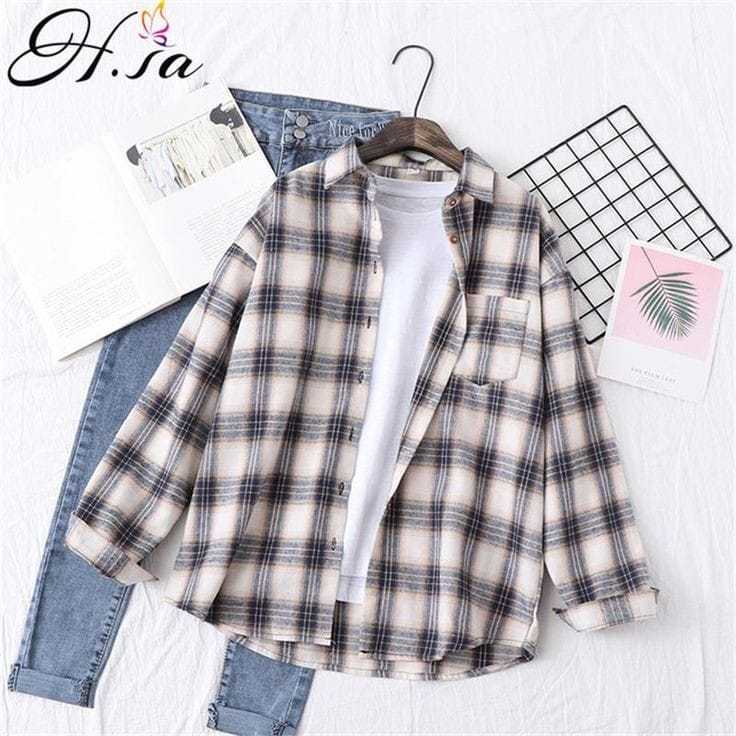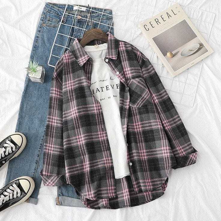 Kemeja flanel wanita lengan panjang motif kotak kotak