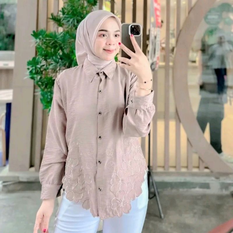 Kemeja Wanita Deanda Motif Bordir / Kemeja Polo Linen Motif Bunga Bordir Kekinian / Blouse Korean Style
