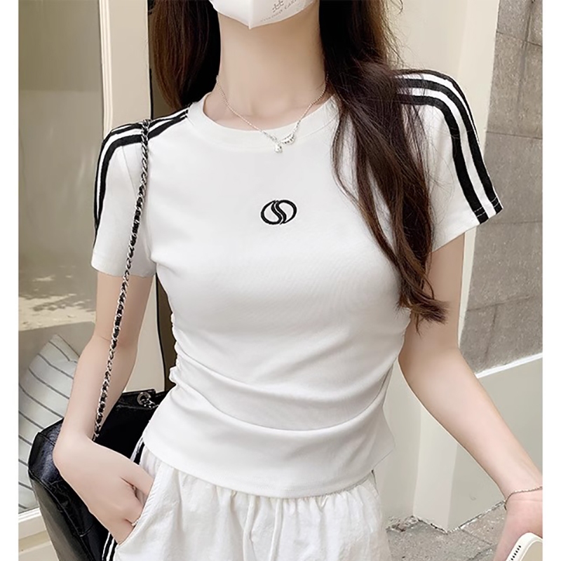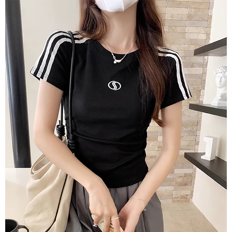 Kaus Lengan Pendek Leher Bulat Bordir Tiga Garis Hitam Baru Atasan Wanita Gaya Korea