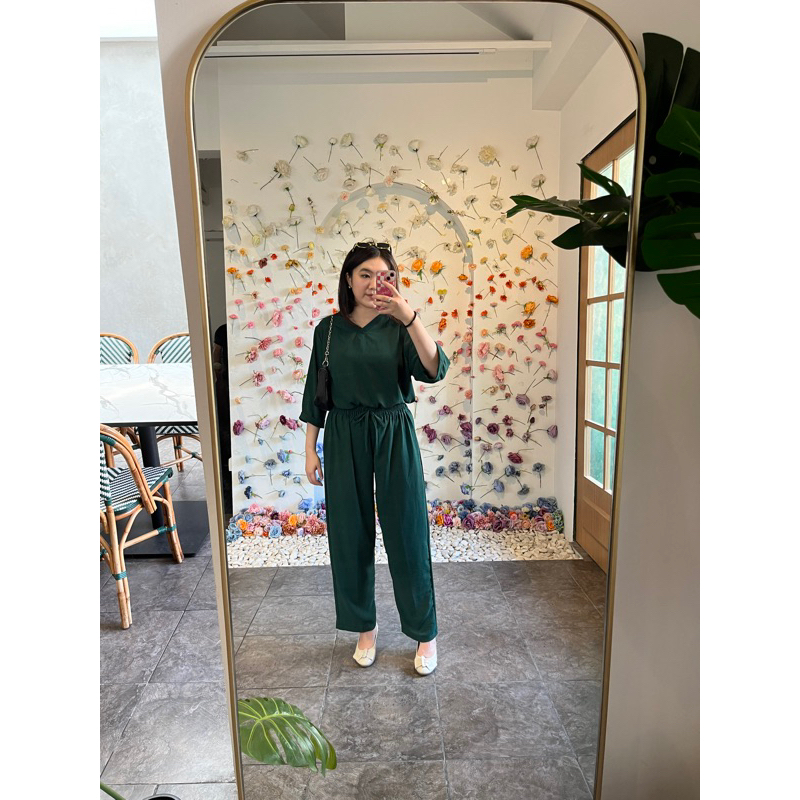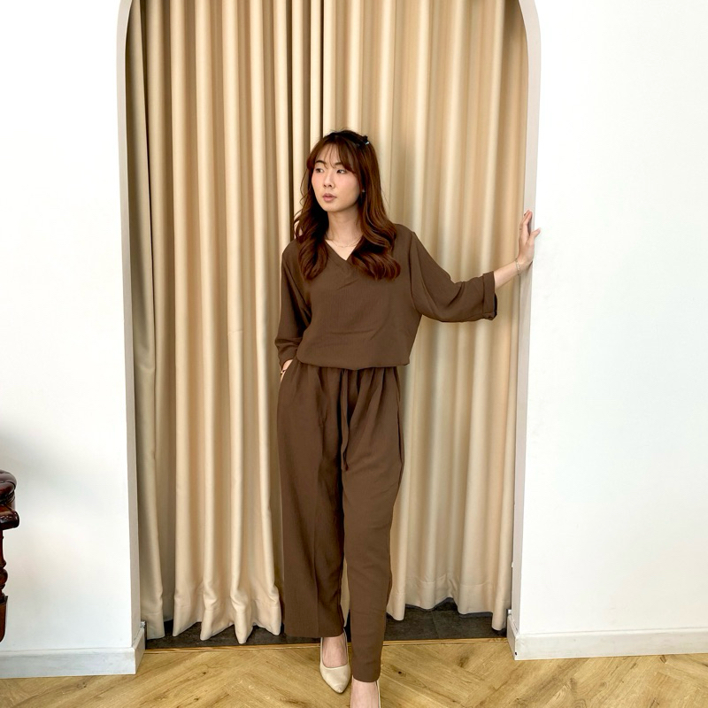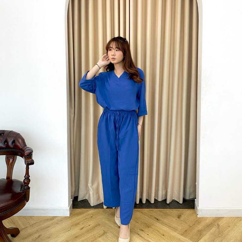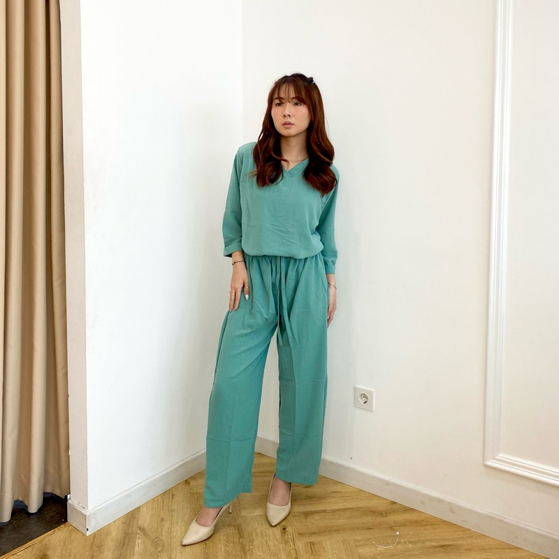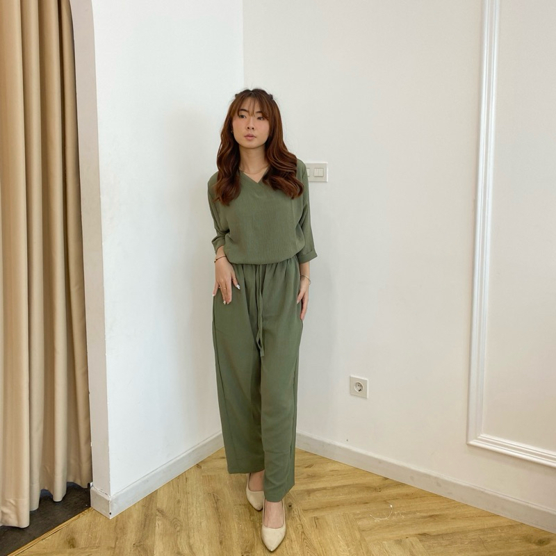 AVE Merisa set | Oneset crinkle Vneck polos lengan 7/8