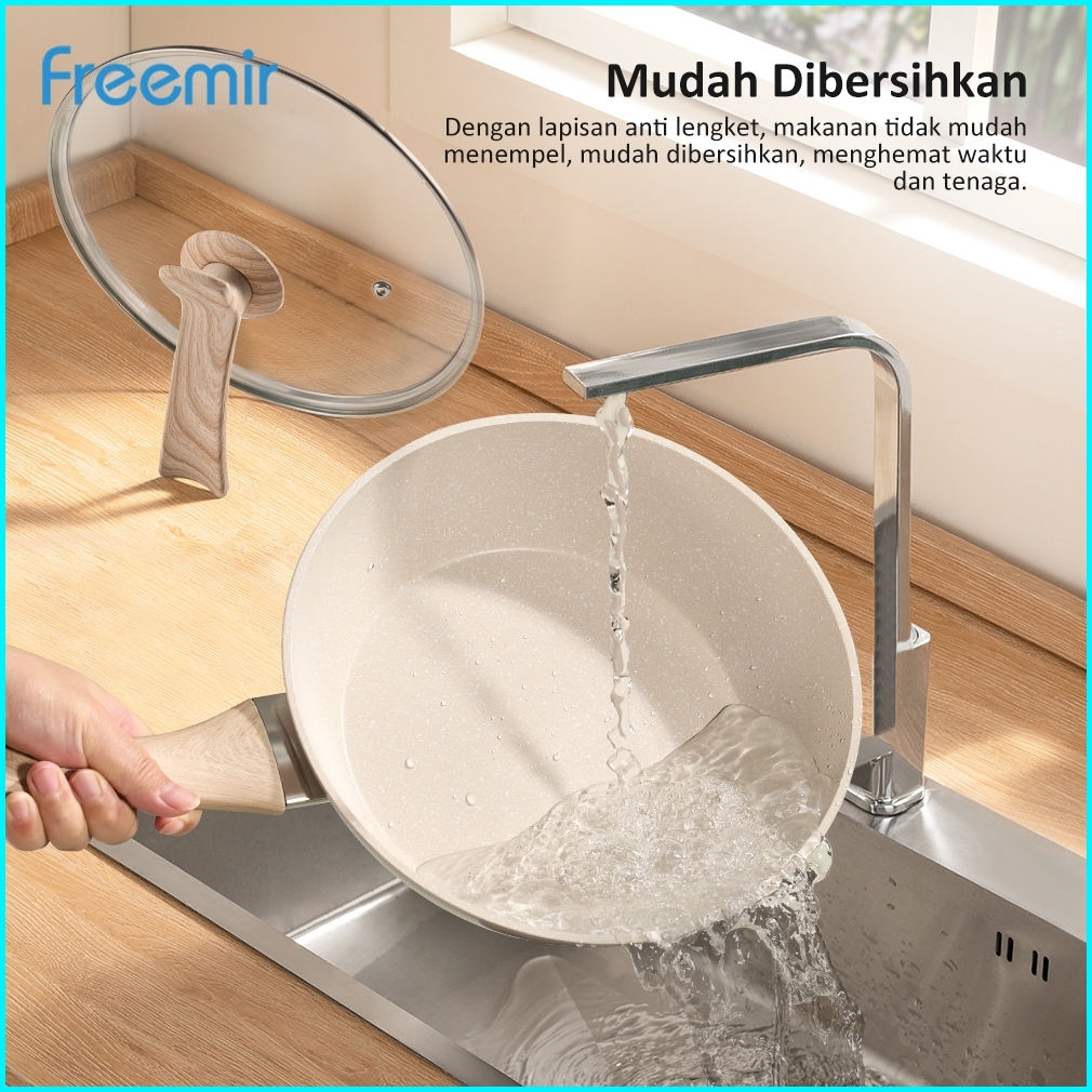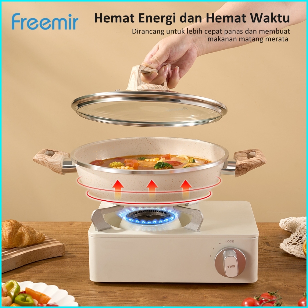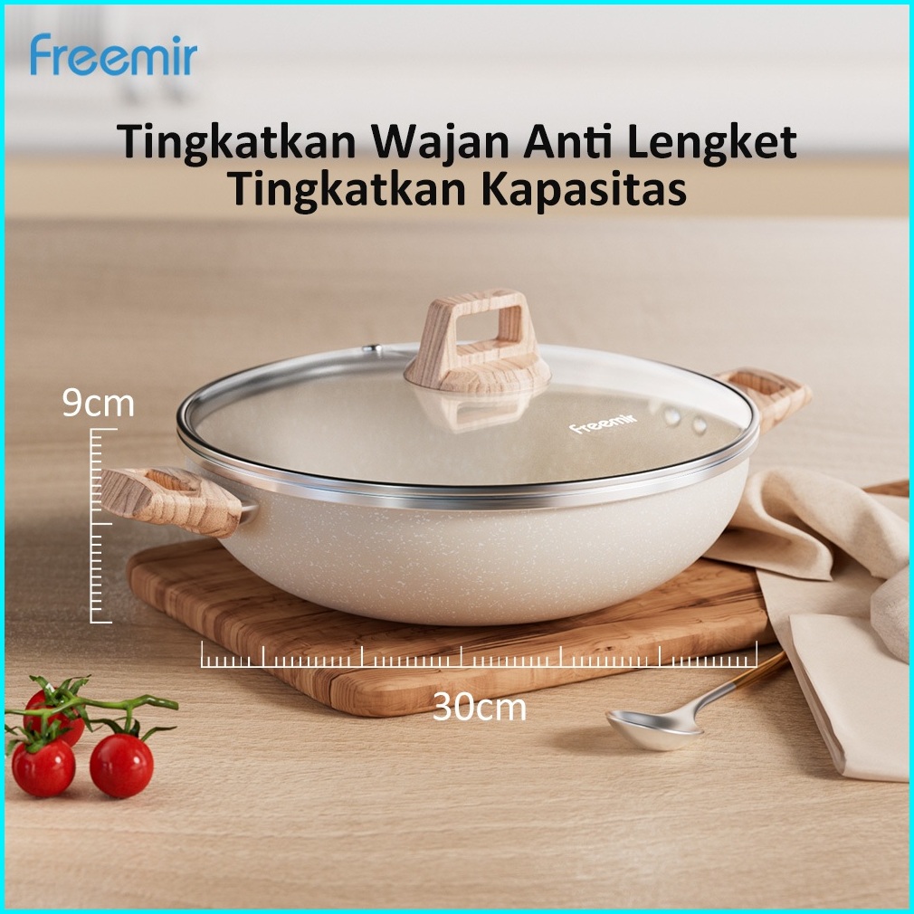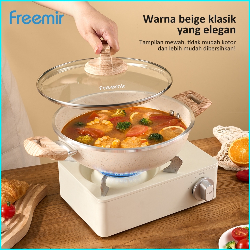 Freemir Wokpan Beige 30 Cm Dengan Tutup Kaca Panci Anti Lengket Wajan Granit Bahan Tebal