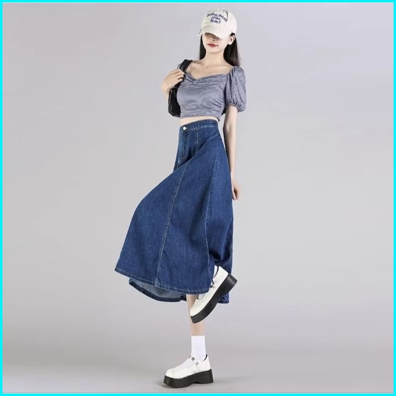 Jisso Rok Jeans Mayung Premium Wanita A- Line 7 8 Model Payung Pinggang Karet - Rok Wanita Hihgwaist Skirt Denim