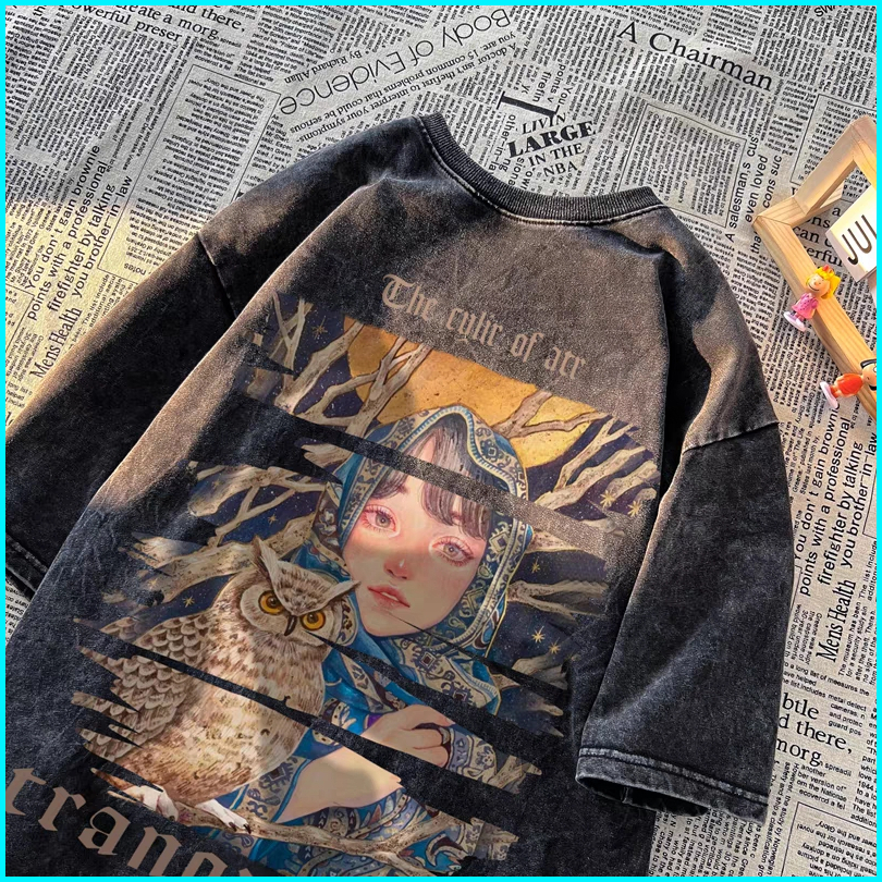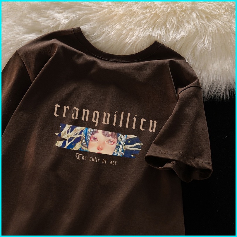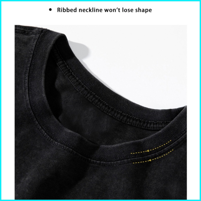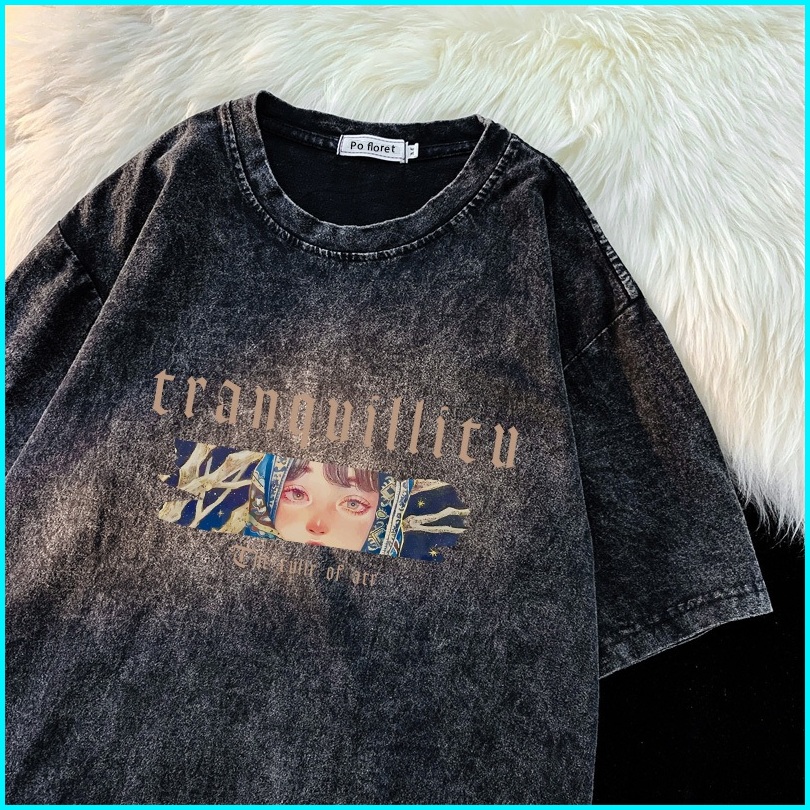 Po Floret Washed T Shirt Oversize Lengan Baju Pendek Kaos Retro Girl Katun Murni Wanita Top Hitam