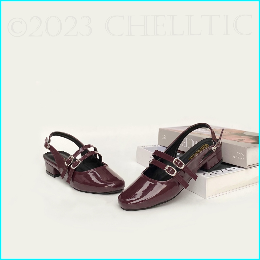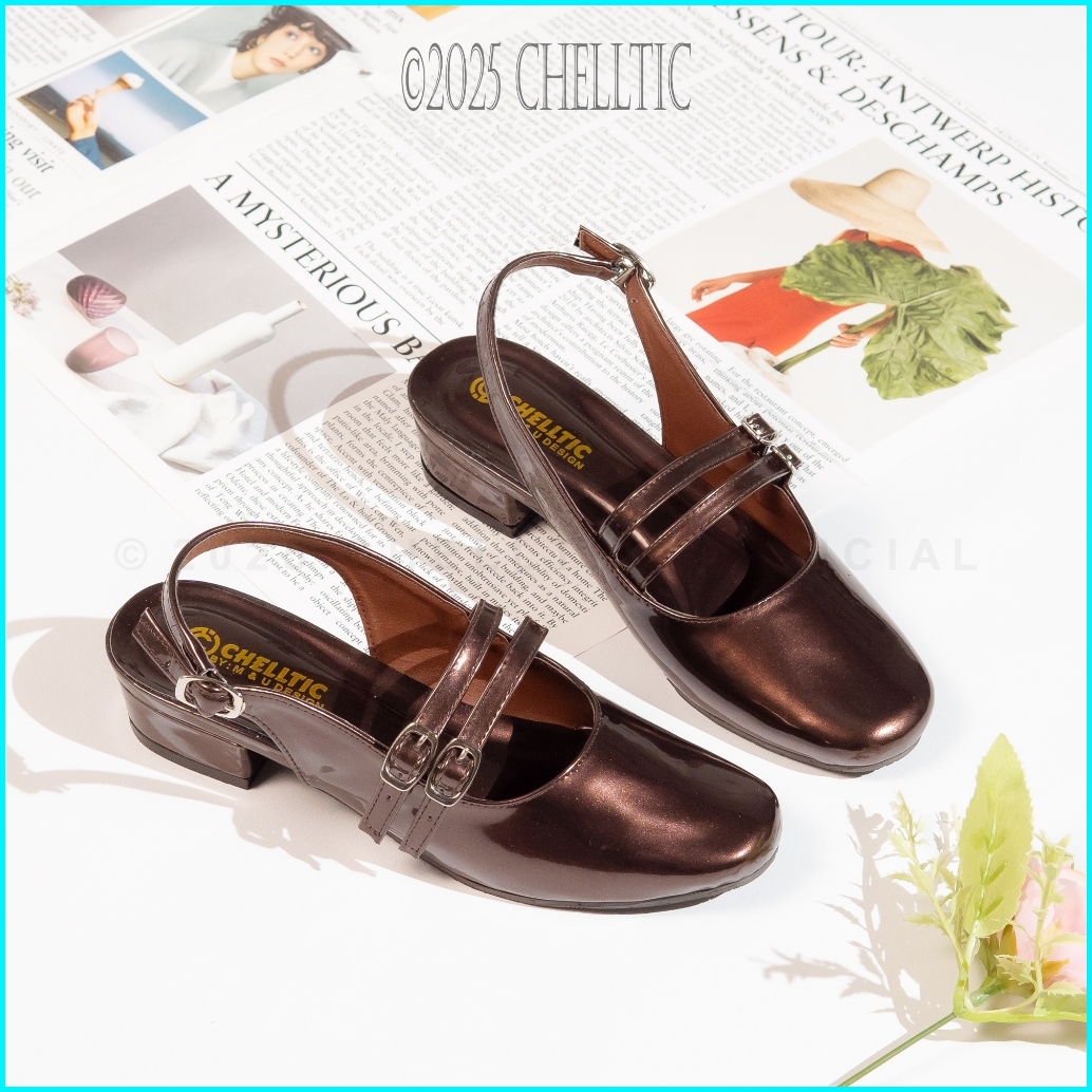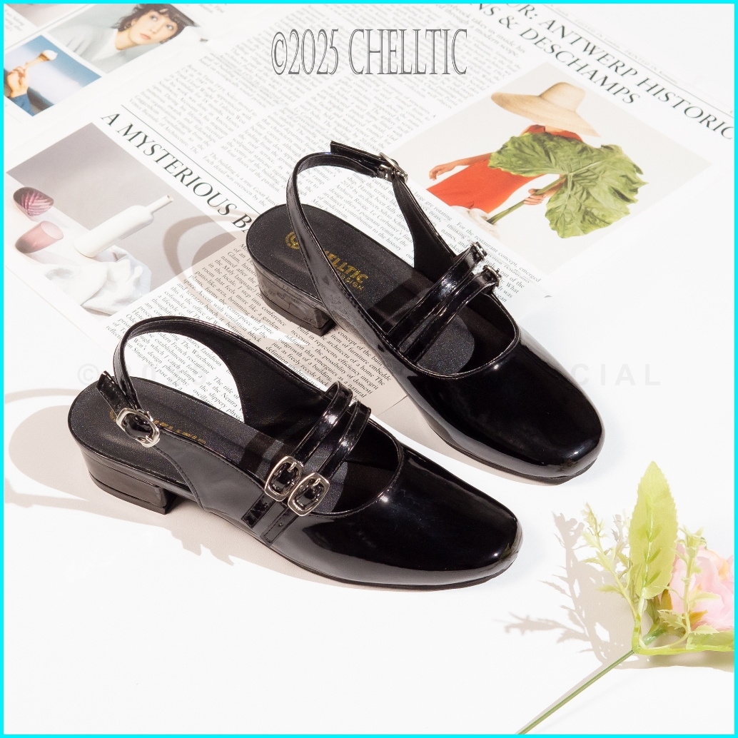Mules Wanita Heels 3cm Sepatu Selop Slip On Tali Gesper Vintage Glosy
