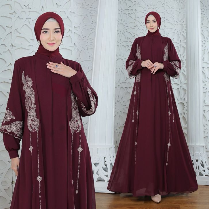 Abaya Cantik Alula by Fataya - Gamis Outer Lepas Pasang 2 in 1 Hitam Motif Sabit, Bordir Benang Keemasan, Bahan Ceruty