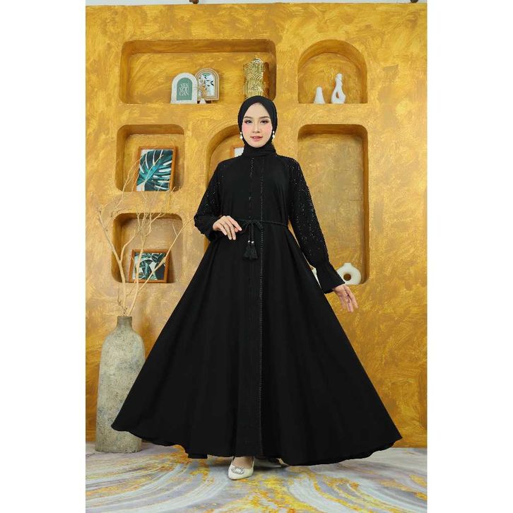 J Collection Gamis Abaya Viral Hitam Jet Black Lebar Resleting Depan Renda Payet