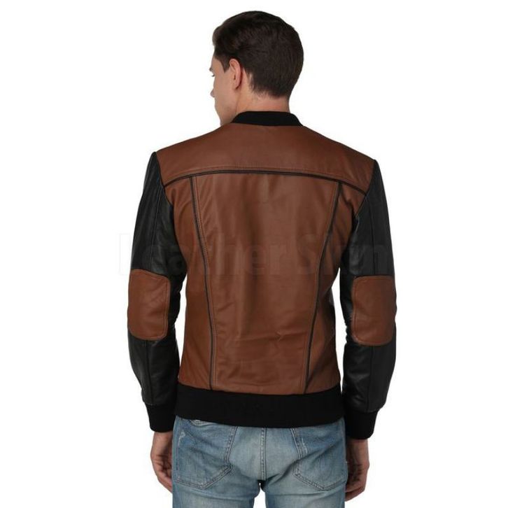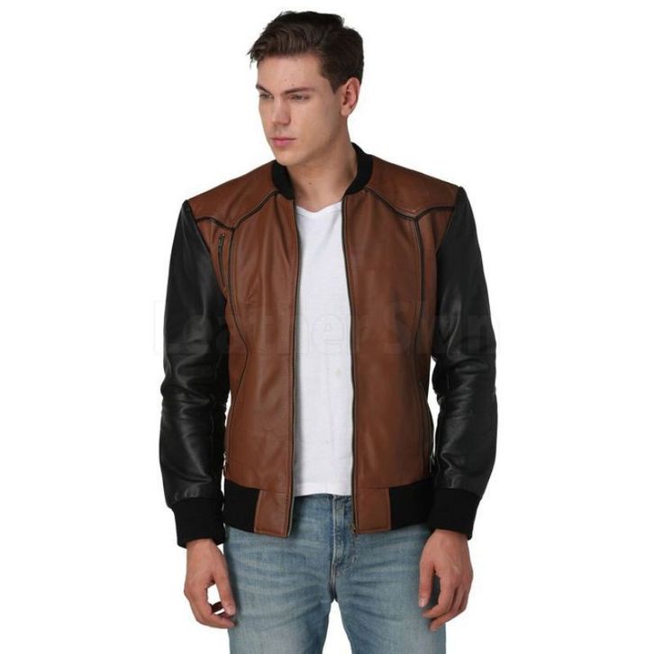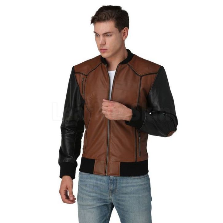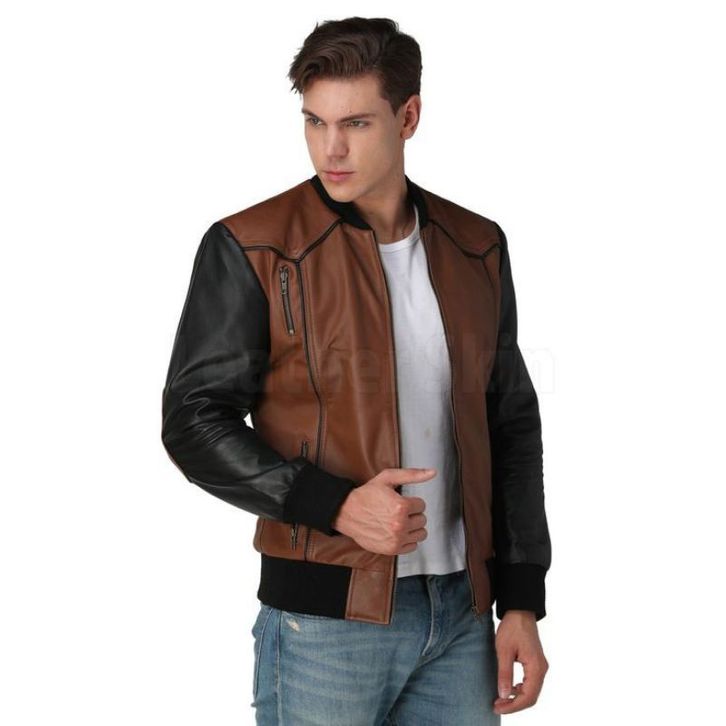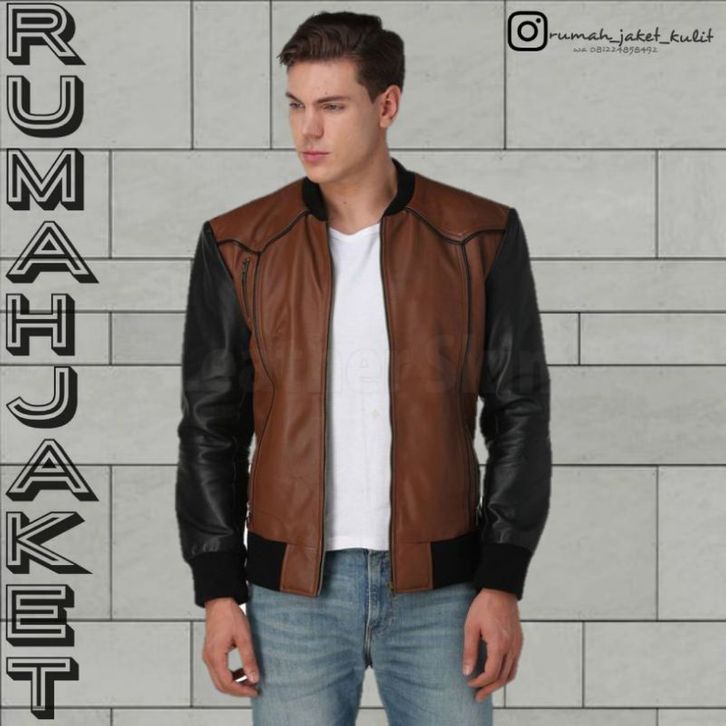 JAKET KULIT BOMBER TERBARU WARNA COKLAT MUDA KOMBINASI HITAM 100 KULIT DOMBA