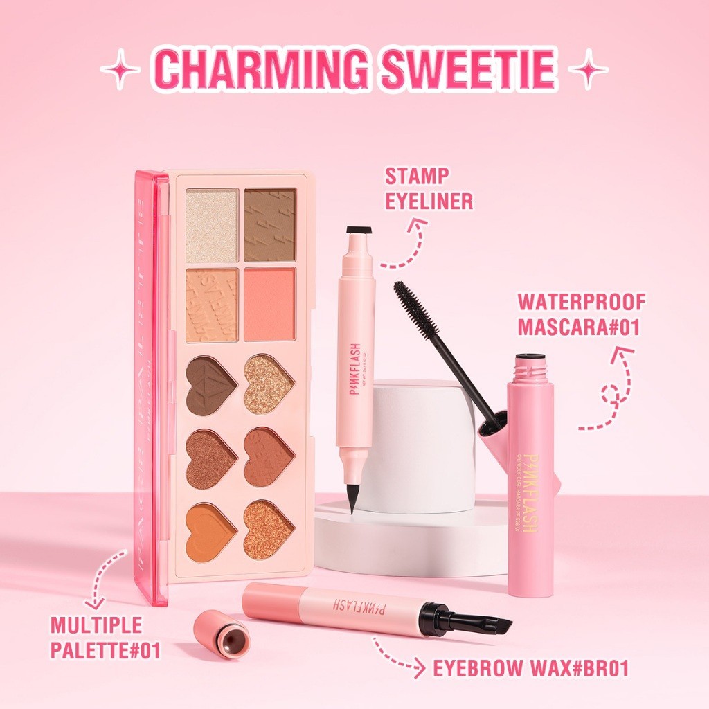 BUNDLE PINKFLASH 4PCS MAKEUP SET INTENSE PIGMENTED EYESHADOW + 2-IN-1 WATERPROOF EYELINER STAMP +LONG WEAR EYEBROW GEL + CURLING MASCARA