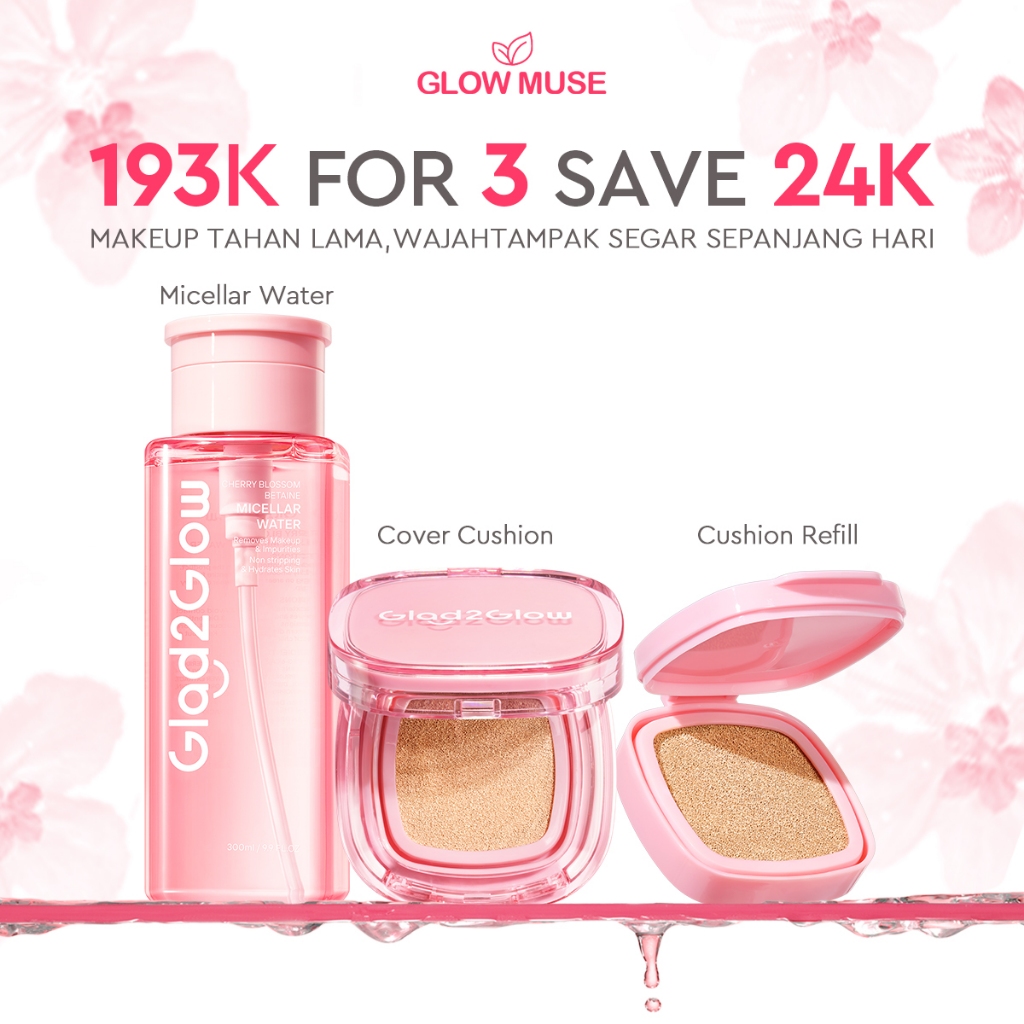 100 PERSEN ORI GLAD2GLOW SET MAKEUP LENGKAP 3IN1 CHERRY BLOSSOM BETAINE MICELLAR WATER + CUSHION FOUNDATION & REFILL SEMPURNA UNTUK MAKEUP SEHARI-HARI TANPA REPOT G2G
