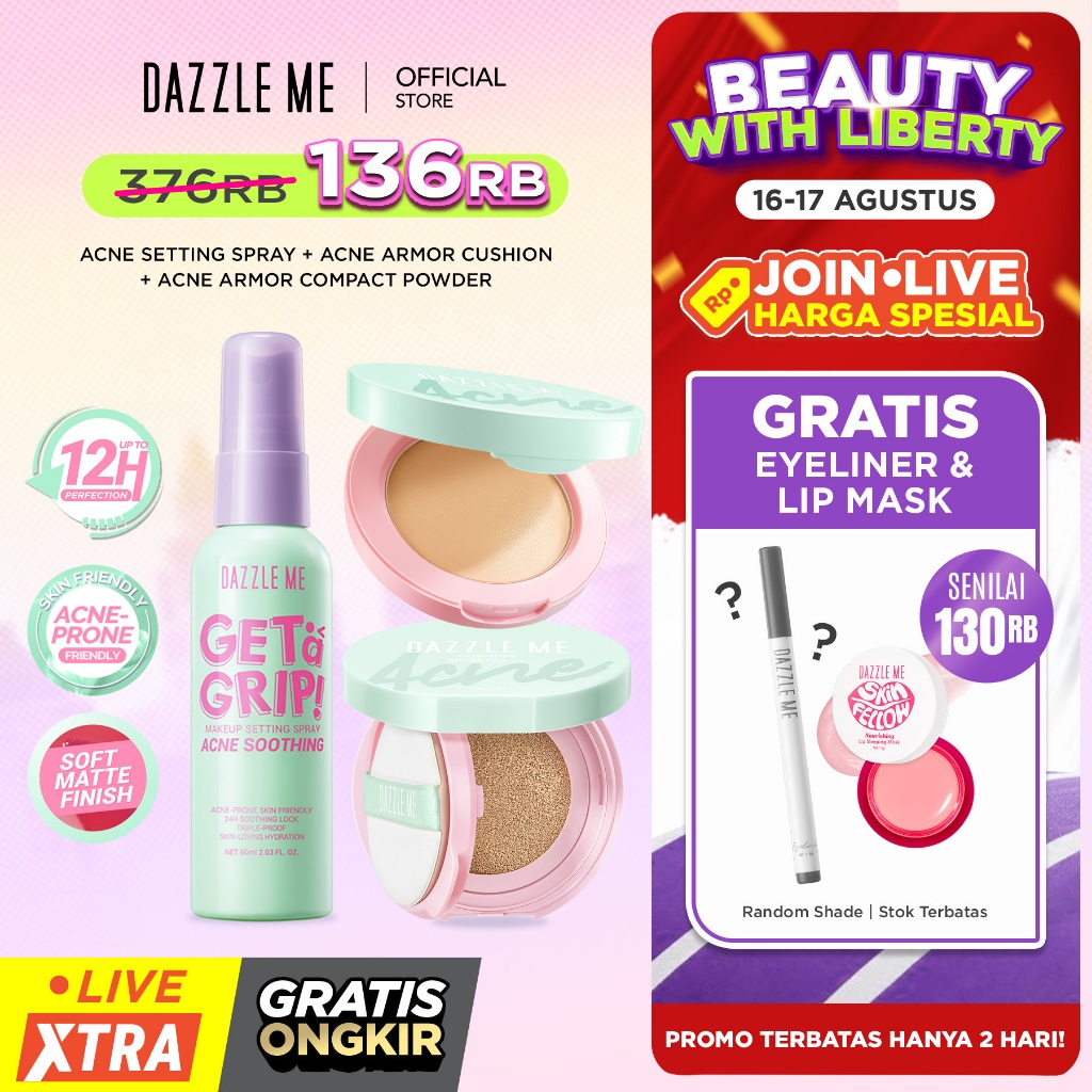 PAKET MAKEUP 3PCS DAZZLE ME ACNE ARMOR MAKEUP BUNDLE ACNE SOOTHING SETTING SPRAY FLAWLESS FLEX COMPACT POWDER CUSHION ACNE-PRONE FRIENDLY TAHAN LAMA UNTUK KULIT BERJERAWAT