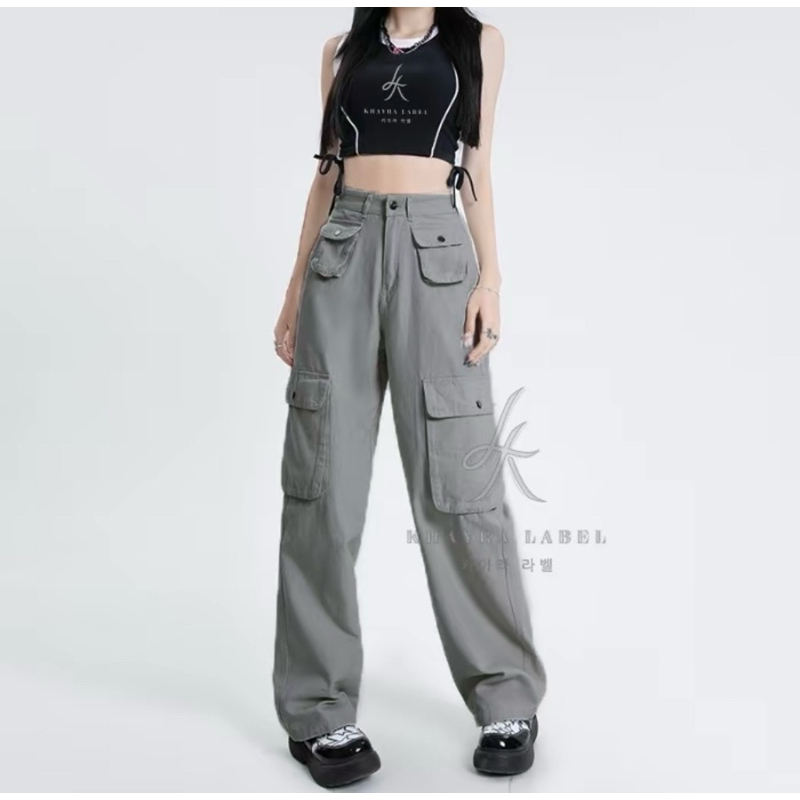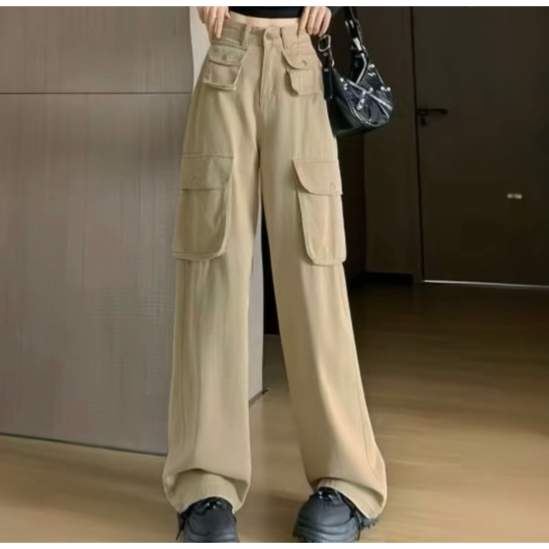 Celana Cargo Denim Highwaist Loose Celana Panjang Wanita Korea