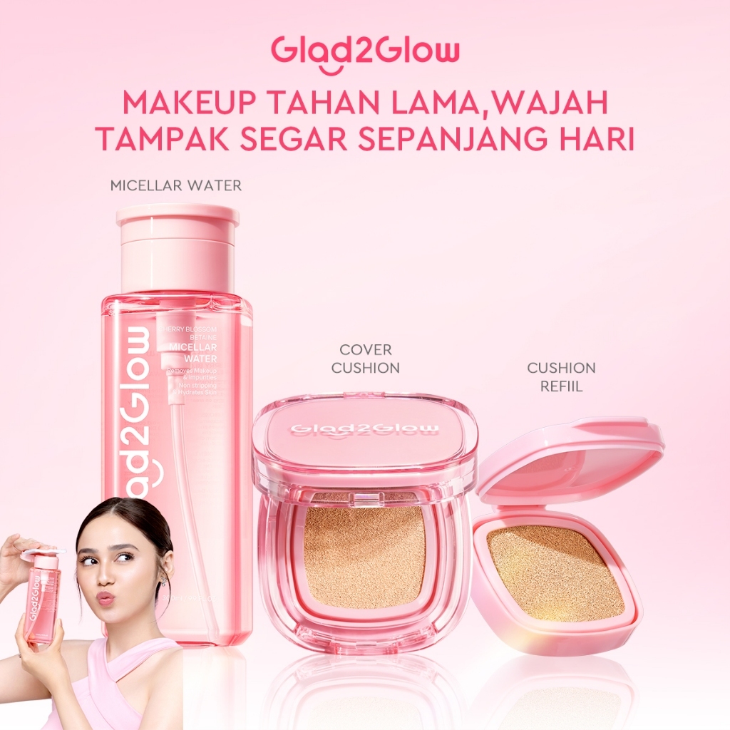 100 PERSEN ORI GLAD2GLOW SET MAKEUP LENGKAP 3IN1 CHERRY BLOSSOM BETAINE MICELLAR WATER + CUSHION FOUNDATION & REFILL SEMPURNA UNTUK MAKEUP SEHARI-HARI TANPA REPOT G2G