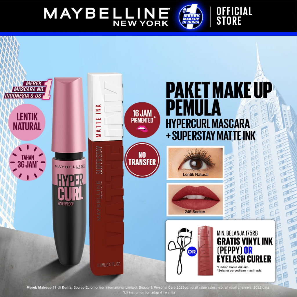 MAYBELLINE OFFICIAL PAKET MAKEUP ANTI TRANSFER HYPERCURL WATERPROOF MASCARA + SUPERSTAY MATTE INK | PAKET MASKARA LIPSTICK