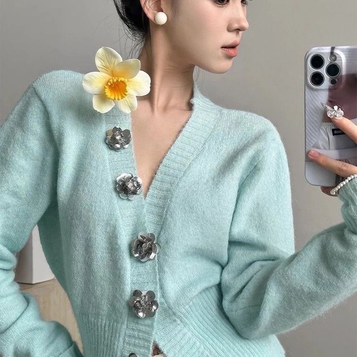 Cardigan Rajut Wanita Korean Style Kancing Motif Mawar 3D Atasan Cewek Jumper V-neack Elegan