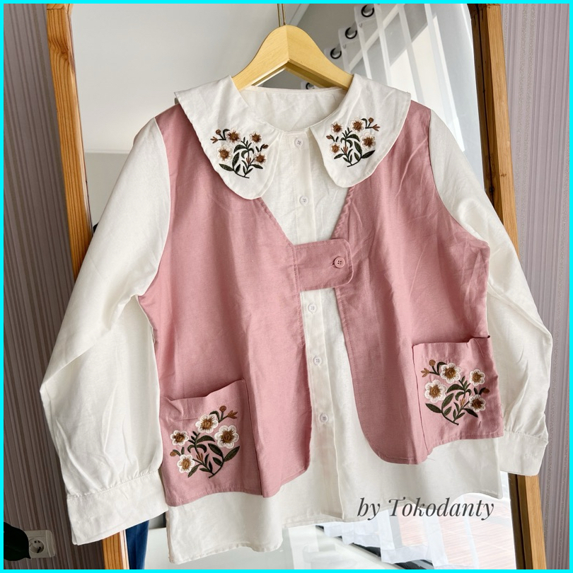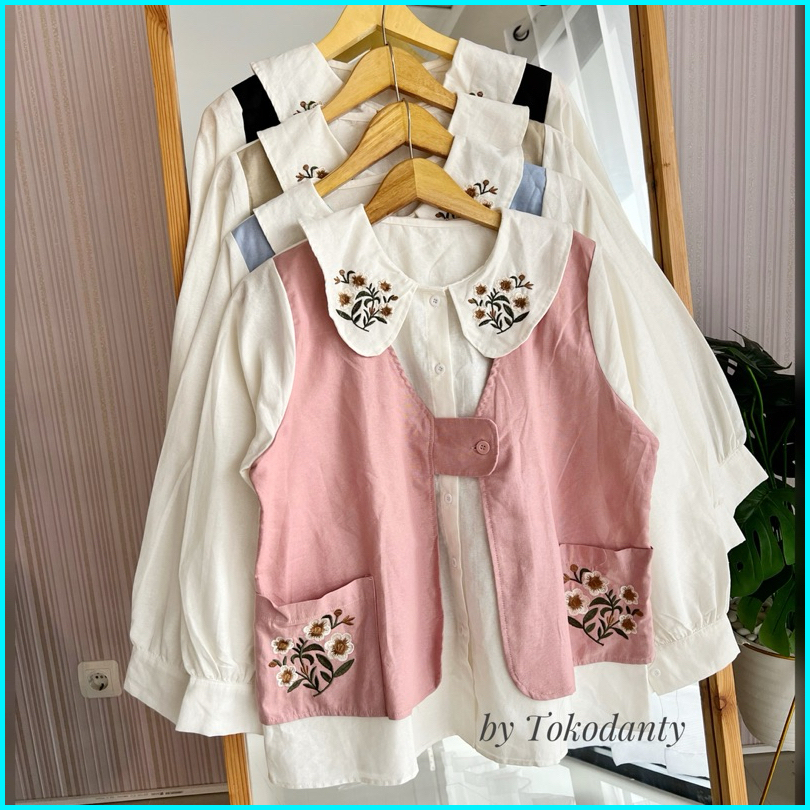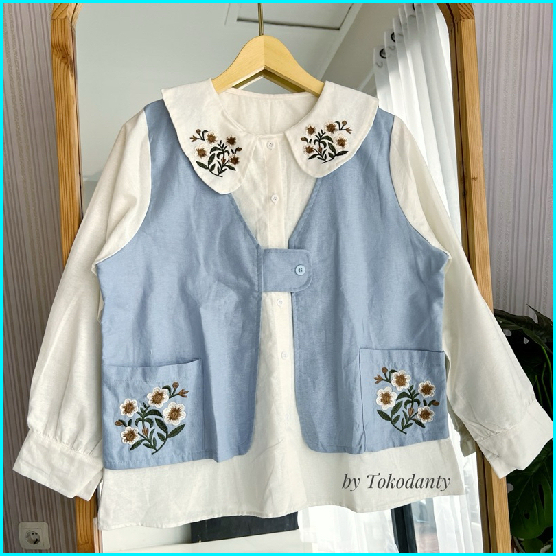 Megumi Shirt - Atasan Wanita - Kemeja Bordir - Rompi Cantik - Katun Linen - Korean Style