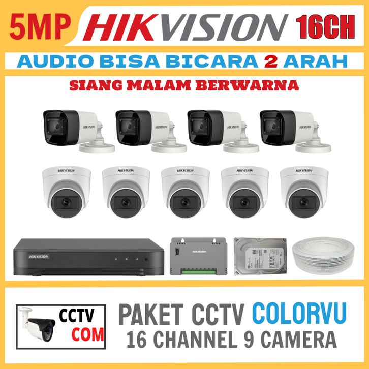 PAKET CCTV HIKVISION 5MP COLORVU 16 CHANNEL 9 CAMERA TWO WAY TALK AUDIO / AUDIO 2 ARAH TURBO HD