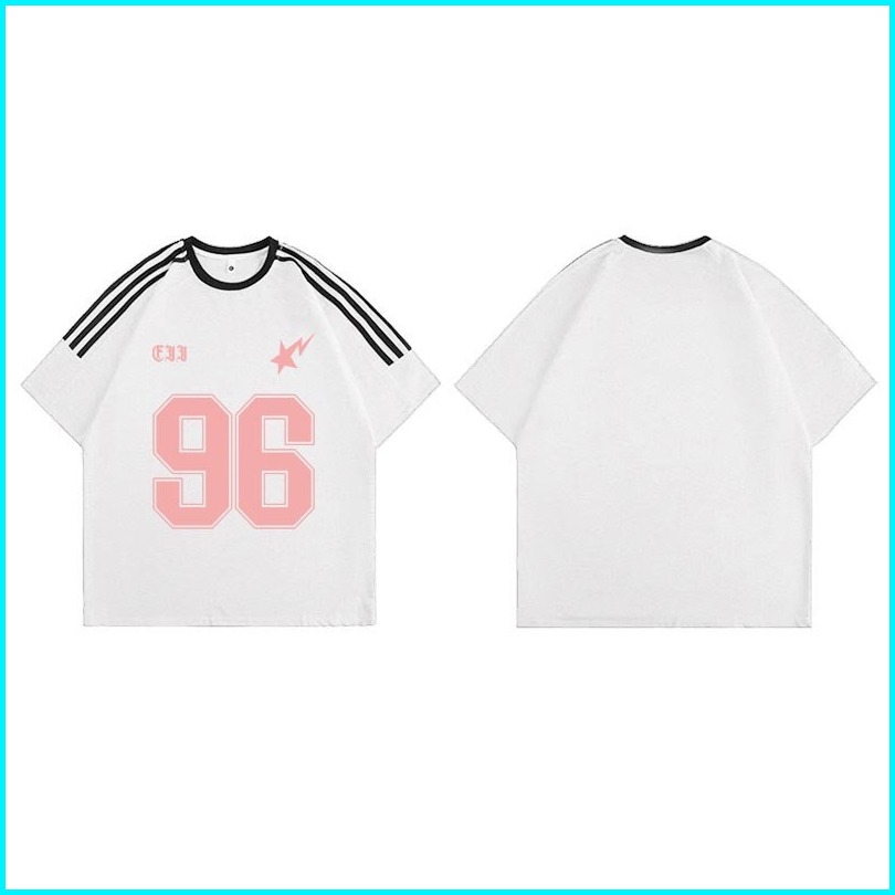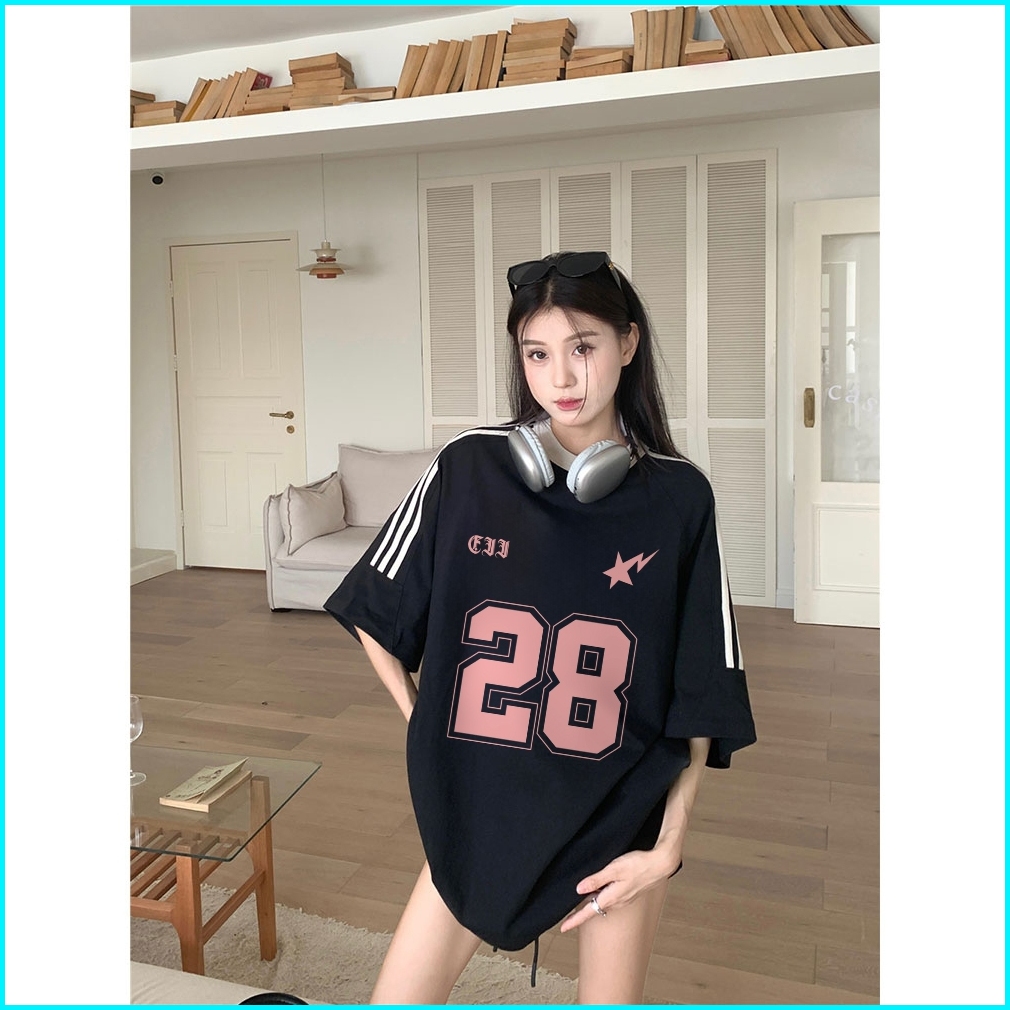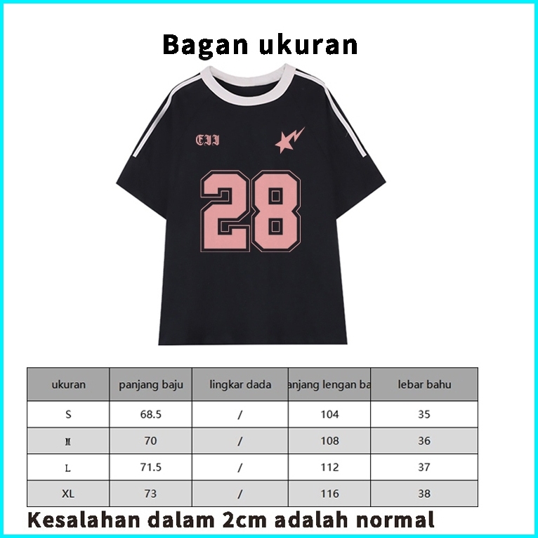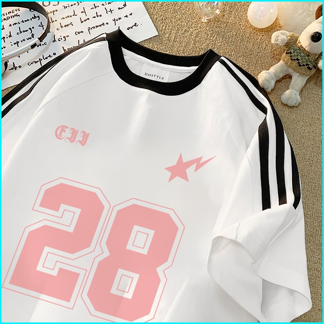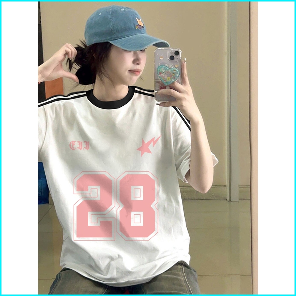 Forteid Cetakan Merek Trendi Retro Baju Oversize Bergaris Bahu Korean Style Kaos Bintang Petir Merah Muda No. 28 Baju Cl
