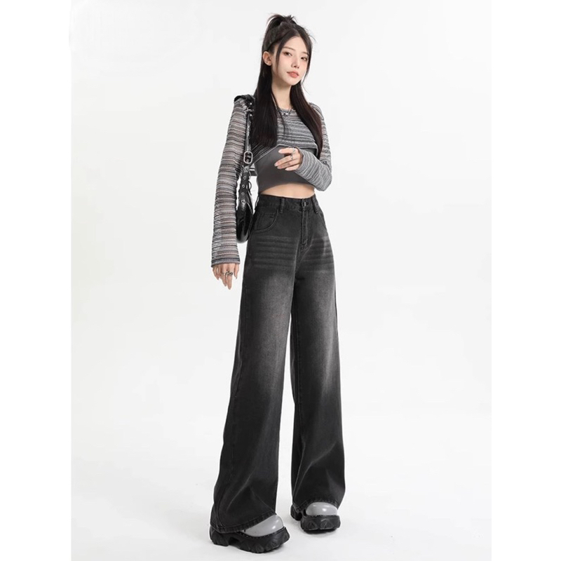 Highwaist Fashion Celana Jeans Wanita Pants Denim Kasual Loose Jins Boyfriend - Hitam abu