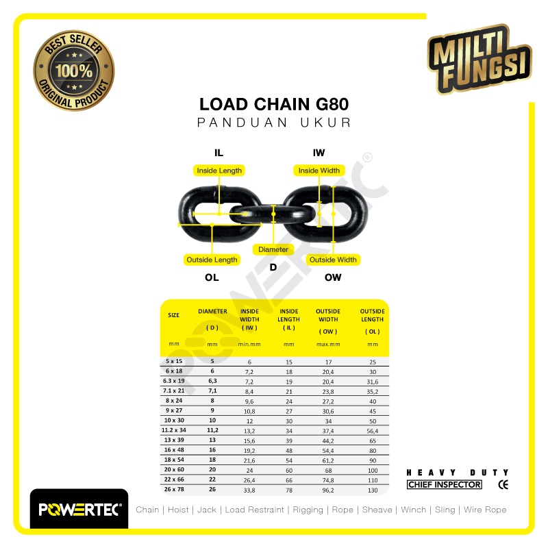 POWERTEC LOAD CHAIN / RANTAI BAJA G80 - 8MM - METERAN