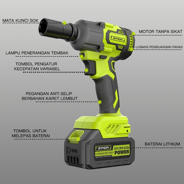 ZPER Brushless Impact Wrench Cordless 988V 800NM Brushless Bor Impact Baterai Mesin Impact Buka Baut Rechargeable Torsi