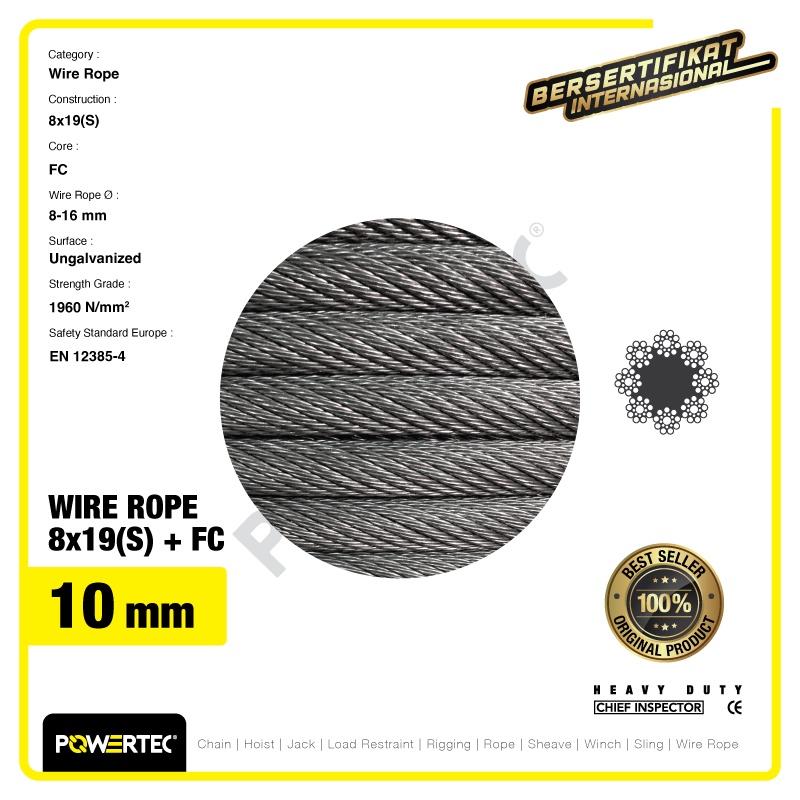 POWERTEC WIRE ROPE / KAWAT SELING LIFT 8X19(S) FC 10MM UNGALV - 1 MTR