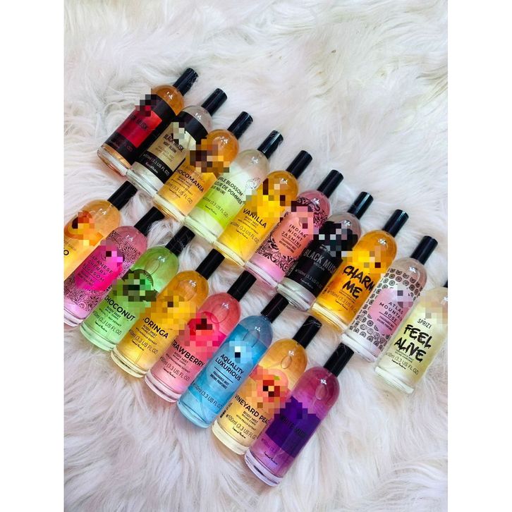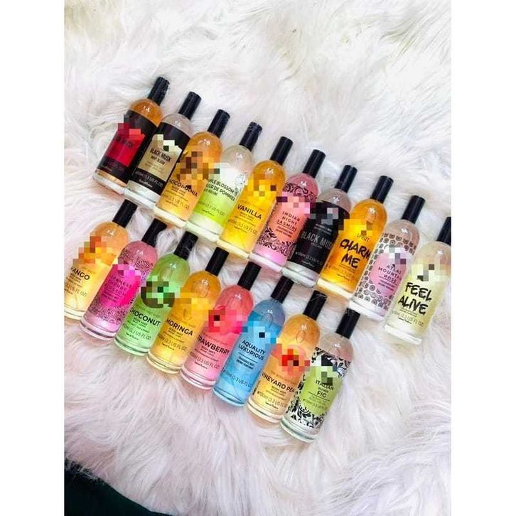 ALL MINe, ATLAS MOUNTAIN, BRITISH ROSSE, CHOCOMANIA, COCONUT, FEEL ALIVEE, FUJI GREENTEA, INDIAN JASMINE, ITALIAN SUMER, MANGO, RANDOM VARIAN, SAY YESS, STRAWBERRY, VANILLA, WHITE misk, WINTER JASMINE, black musk, chocolate, english dawn garden, fijian water lotus, jap cheery, juicy pear, let's bloom, moringa, satsuma, shea, sweet melon, venyard PEACH