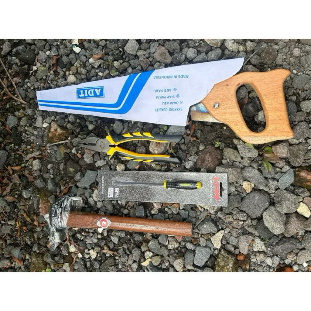 PAKET TUKANG PALU, GERGAJI, LINGGIS, CETOK SEMEN, KIKIR, TANG SEPAKET 6 IN 1 MURAH KUALITAS BAGUS