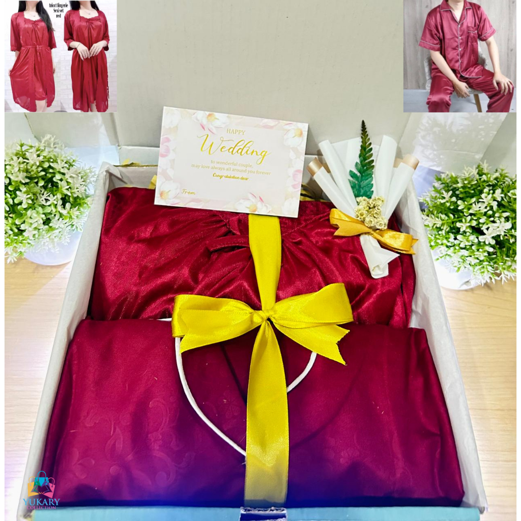 HAMPERS WEDDING BAJU TIDUR SATIN COUPLE/PIYAMA COUPLE/ HADIAH PERNIKAHAN SETELAN PIYAMA DAN LINGERIE