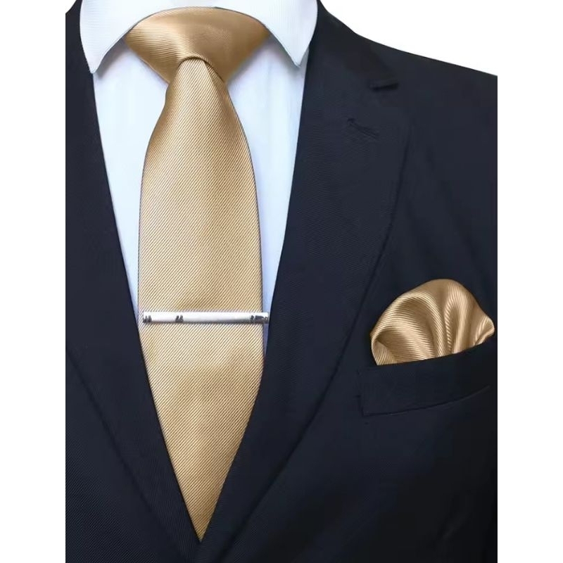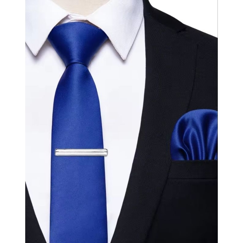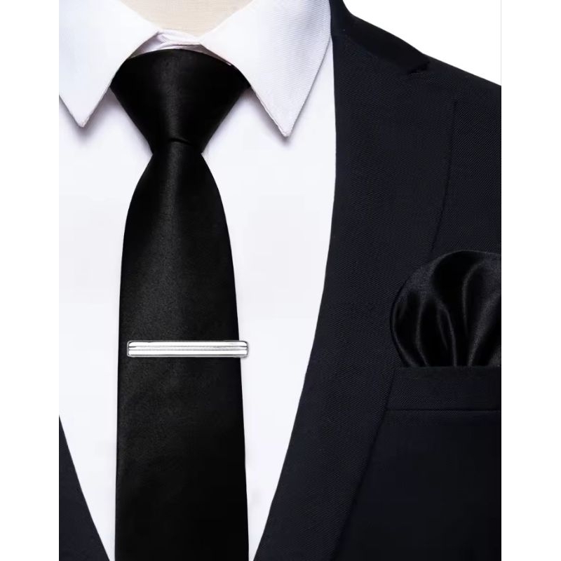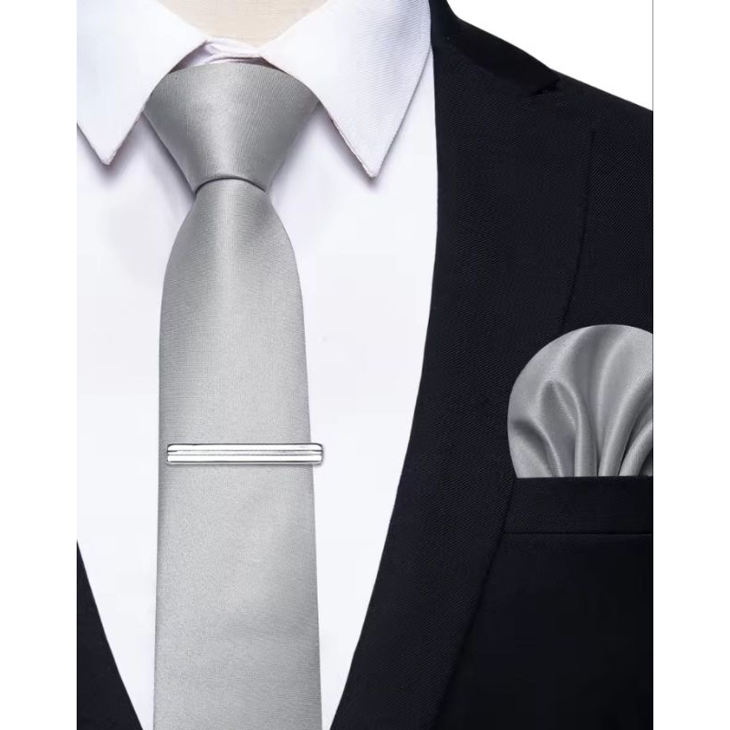 DASI NECK TIE POLOS PLUS POCKET SQUARE DAN JEPITAN DASI SILVER METALIK UKURAN DASI 3 INCHI SIAP PAKAI