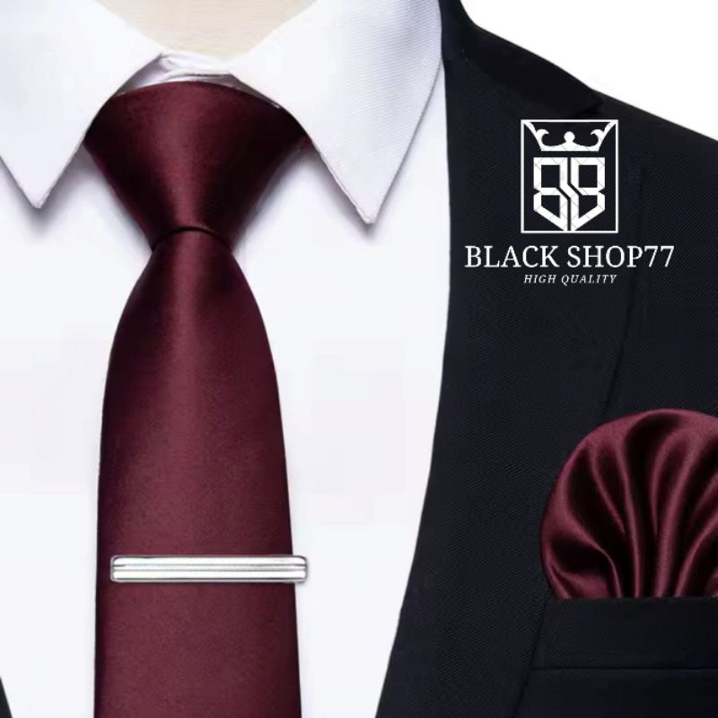 (PACKING BOK) DASI PRIA SATIN PANJANG PAKET HEMAT DASI+TIE CLIP+POCKET SQUARE MAROON TUA