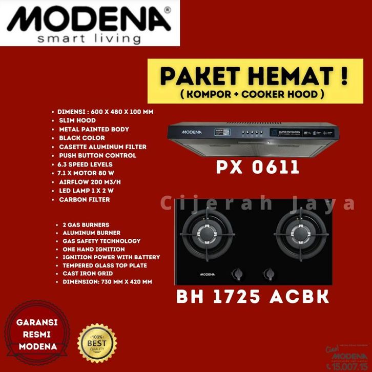 MODENA PAKET KOMPOR TANAM 2 TUNGKU BH 0725 + SLIM HOOD PX 6001