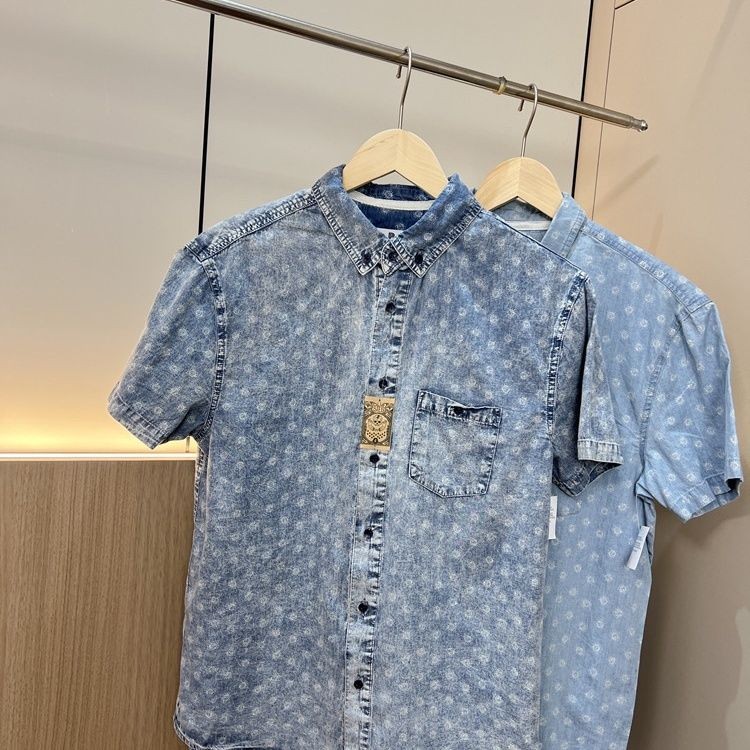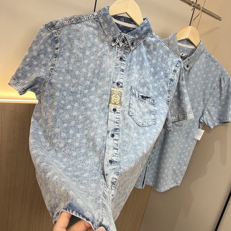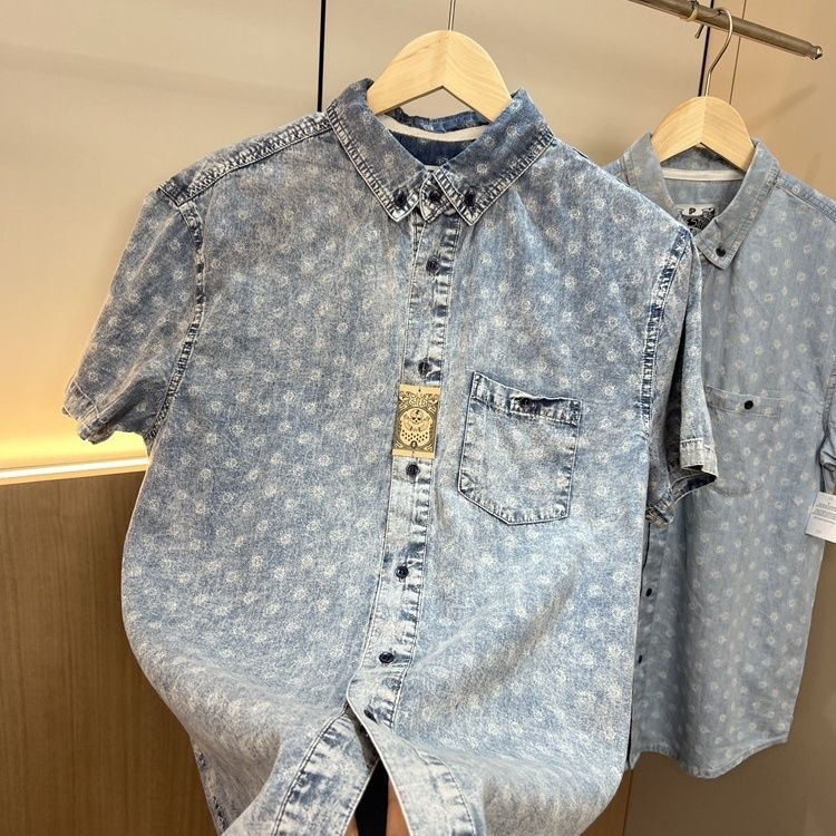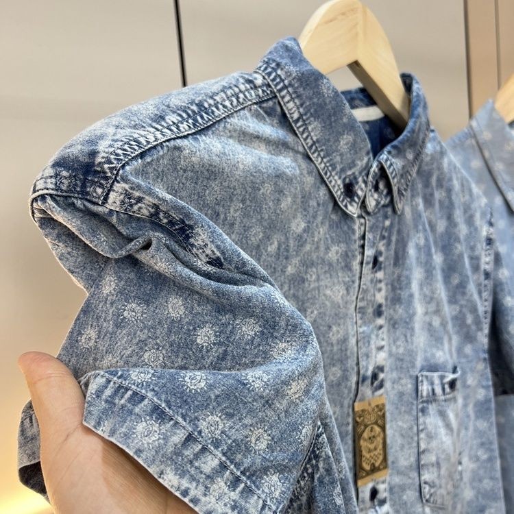 Kemeja Denim Pria Katun 100% Lengan Pendek - Vintage Washed Breathable, Gaya Retro Amerika