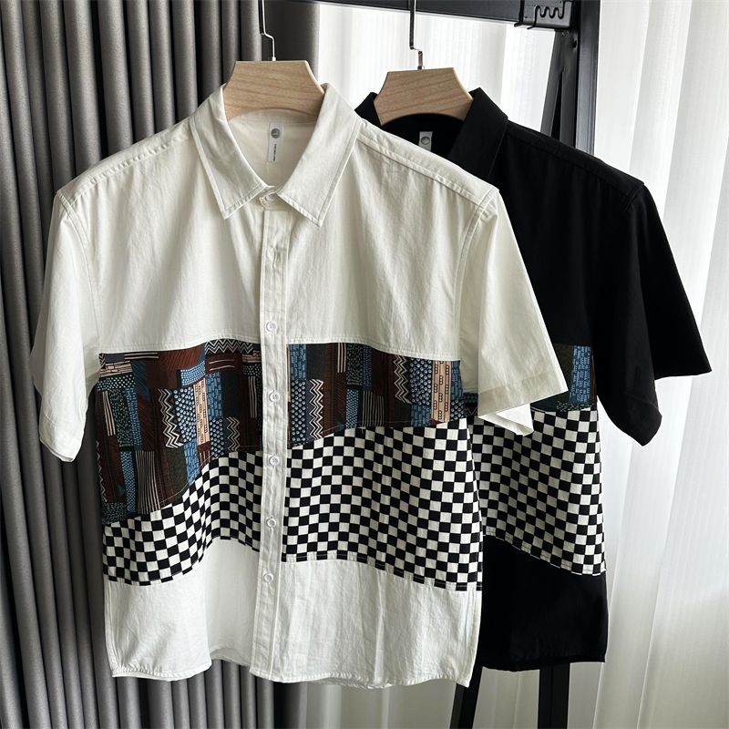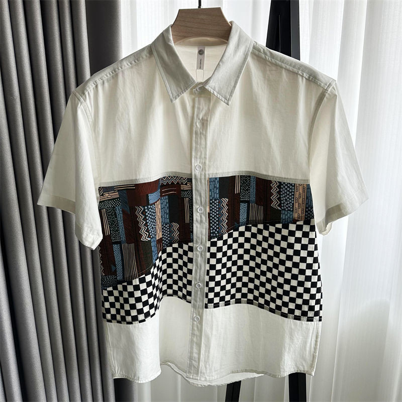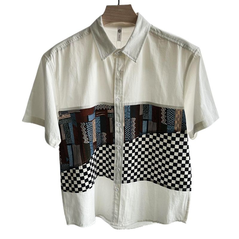 Vintage Color Block Shirt Men Summer Short Sleeve Shirt Men's Casual Top