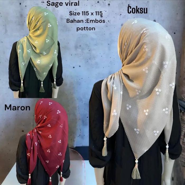 hijab square segi empat tasel motif bunga bintang Size 115 x 115 Kerudung Muslim Cantik - HITAM